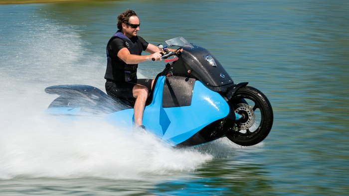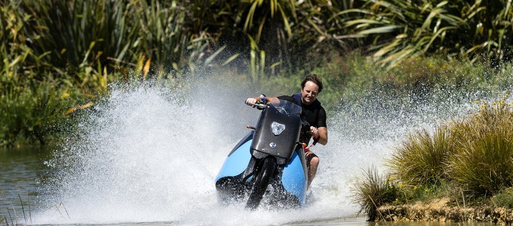 比斯开 这是 水陆两用摩托车,转化为 摩托艇。一款有趣且非常实用的两栖动物,可以直接从陆地驾驶到水中,由 艾伦·吉布森。从一种驾驶模式切换到另一种驾驶模式甚至非常短(大约 5秒) 这样当您驶入或驶出水面时几乎不会失去动力。