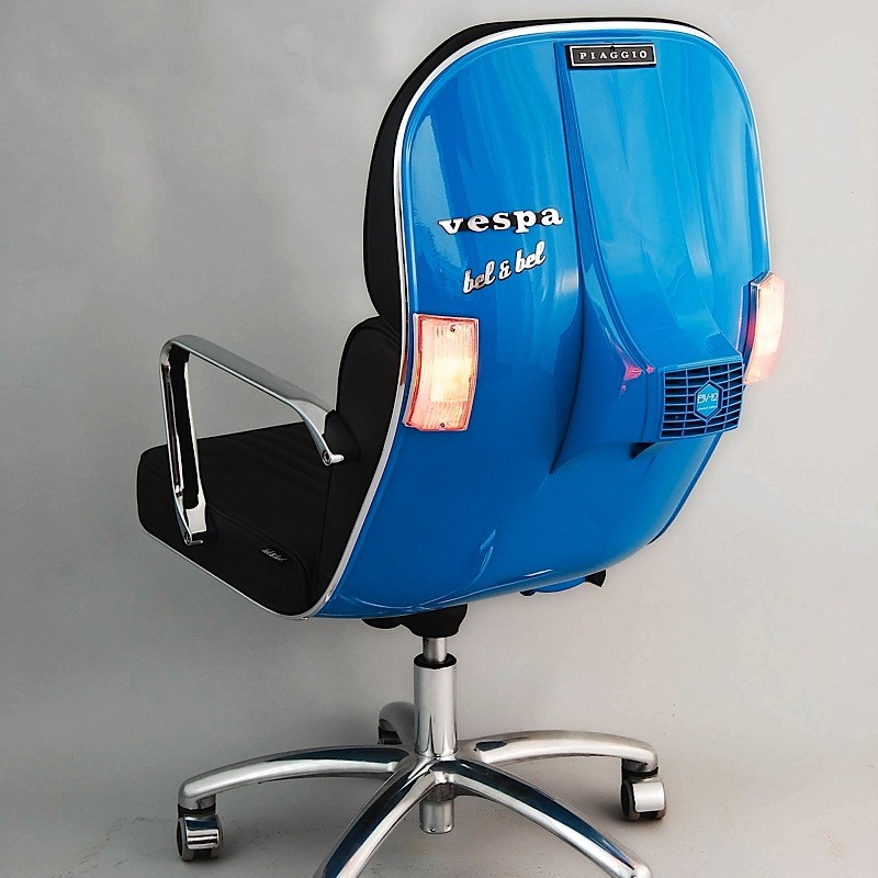 除此之外,在 2013 年巴塞罗那电动博览会上,Bel & Bel 公司还展示了一款带有 Vespa 部件的办公椅和一款有趣的两座椅 座位600,它还通过头灯为房间提供照明。