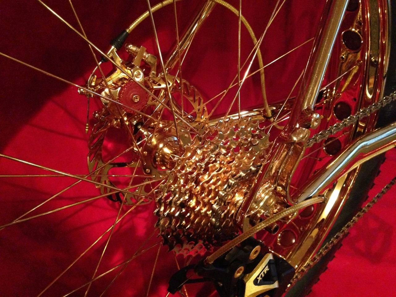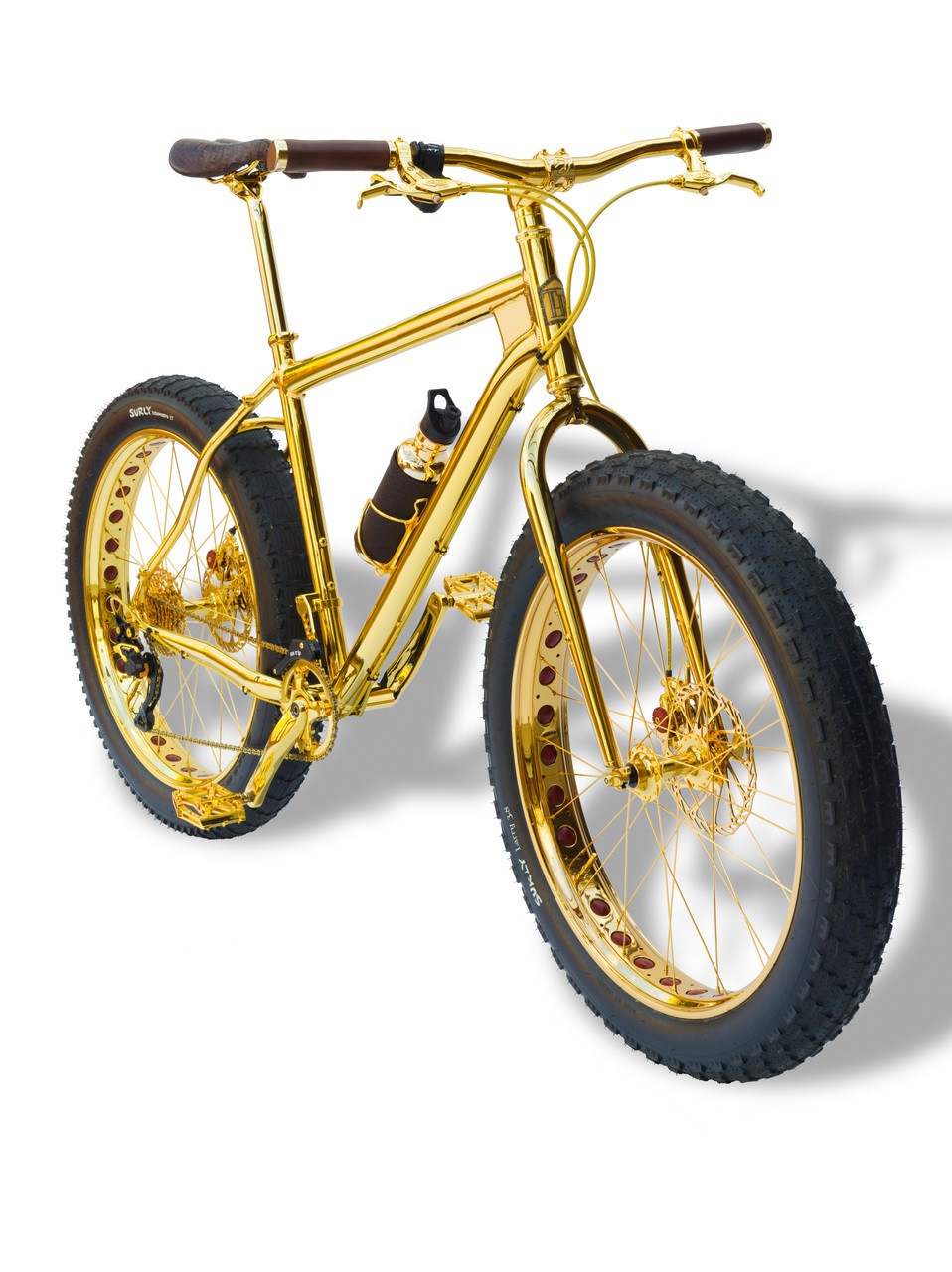 纯金山地自行车 它由纯金制成,不仅是自行车的车架,而且几乎是您能想象到的所有部件。例外的是巧克力棕色的座椅 鳄鱼皮、手柄和金色瓶子的一部分 鲨鱼皮,以及前后拨链器部件。就连标志也将与威望保持联系,因为它会撒上多达 600 个黑色 钻石 (6克拉)和500黄金 蓝宝石 (4.5 克拉)。