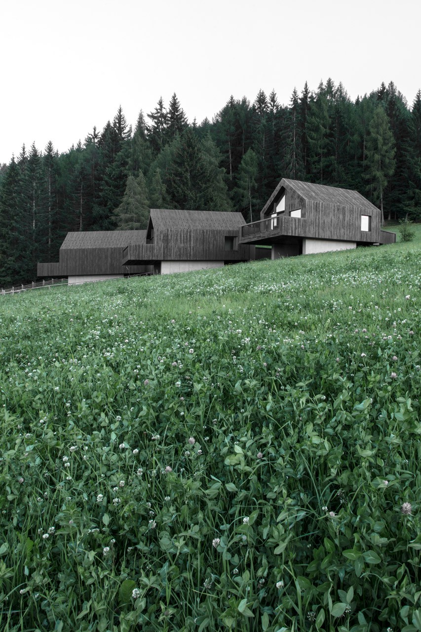 Bergmeisterwolf 风扇森林屋 位于森林边缘的草地上 - 三个 “木屋”, 站在 具体的 基础 他们统治着这片土地,他们被木板覆盖 黑色的 木头 它们与针叶林的深色融为一体。