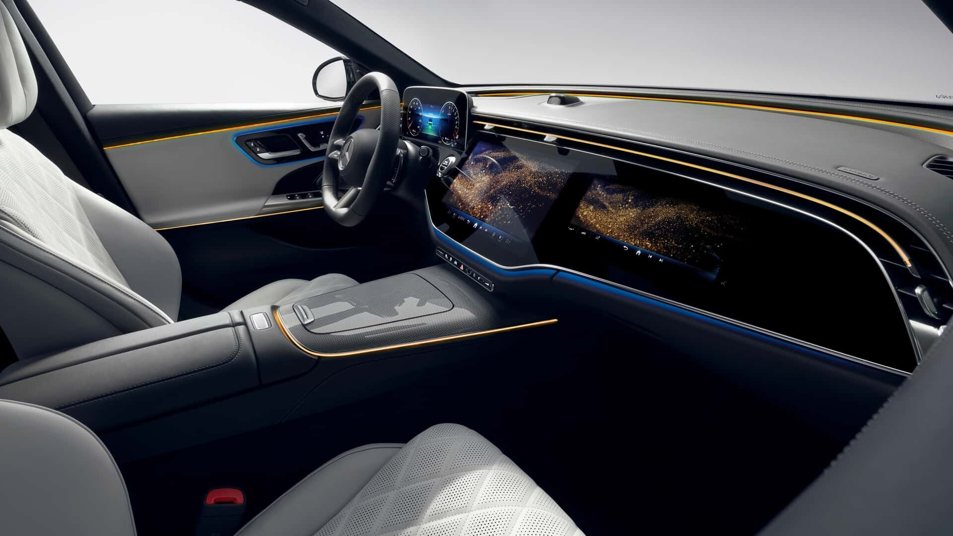 E级内饰 代表了优雅与尖端技术的完美结合。 MBUX 超级屏幕提供身临其境的信息娱乐体验,而可选的乘客显示屏则增添了独特性。客舱拥有更大的头部空间和腿部空间,肘部宽度几乎与S级相同,确保所有乘客的舒适乘坐。
