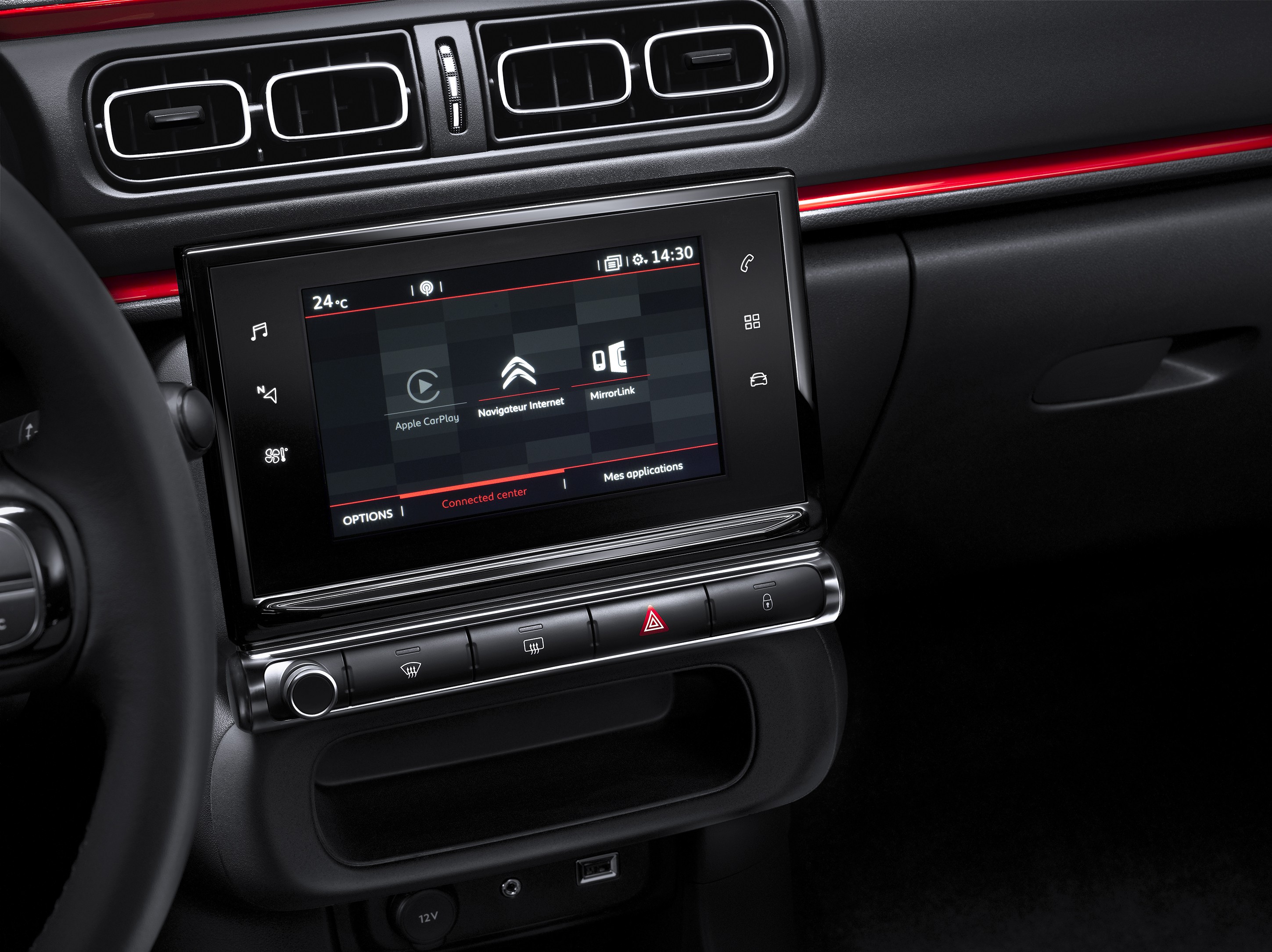 中间是一块 7 英寸的触摸屏,上面搭载着城市汽车雪铁龙 C3 的连接技术。