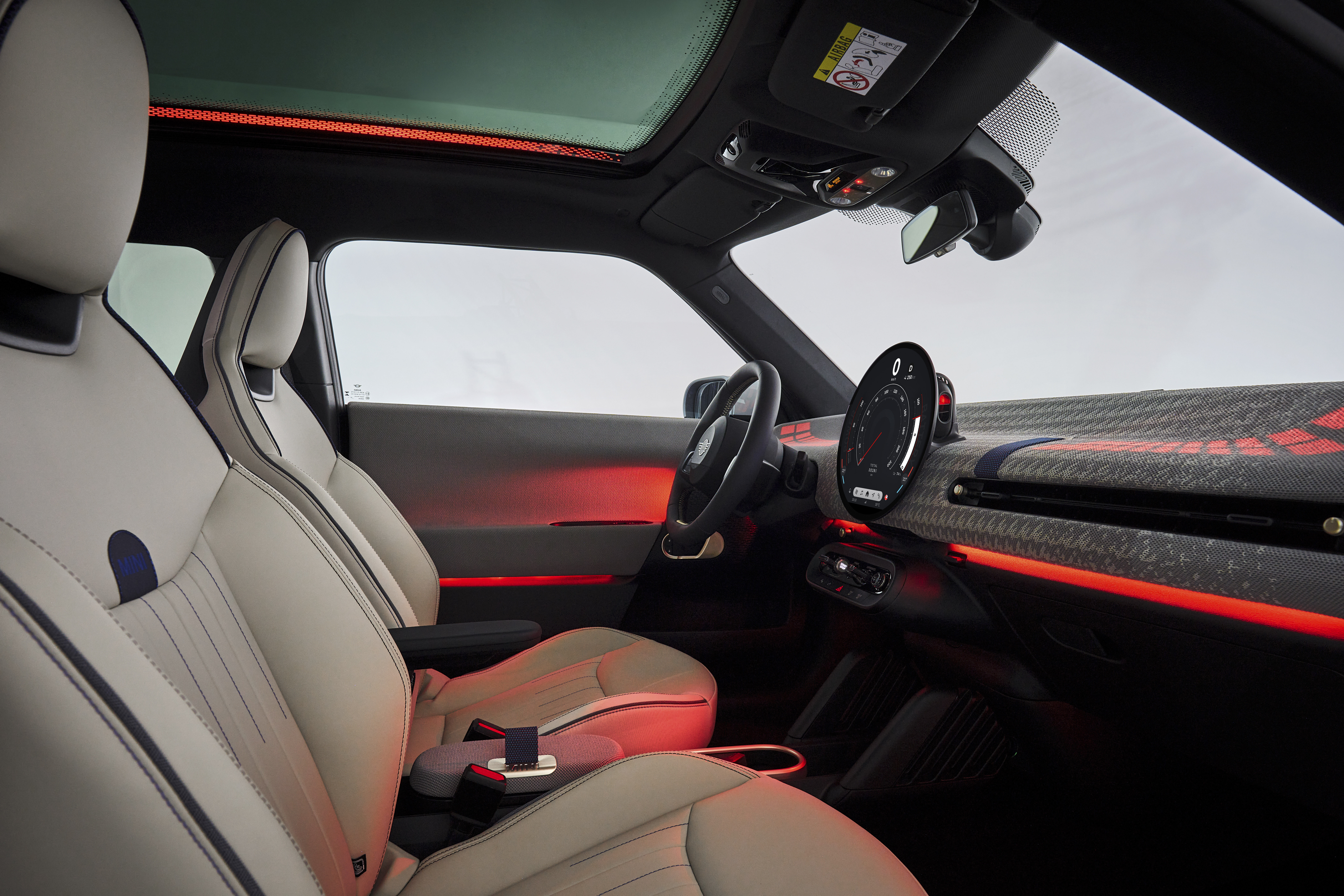 内饰简约、数字化且温馨宜人。想象一下,外面下着雨,坐在舒适的客厅里,但这间客厅配备了最新的技术。虽然它可能看起来很复古,但它绝对不是这款电动 MINI Cooper EV 2024。凭借高清 OLED 屏幕和 MINI OS 9,驾驶这辆车就像旅行到未来一样。