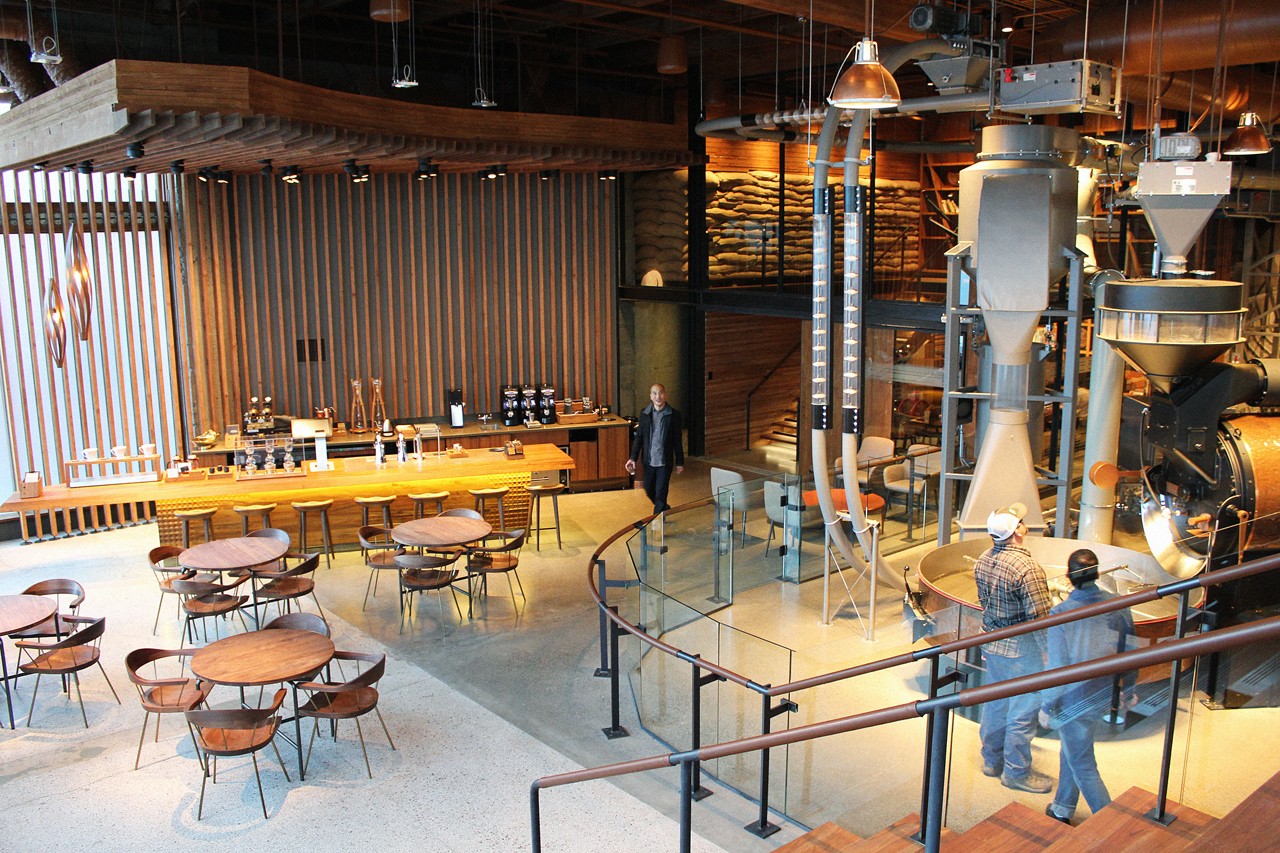 最新的酒吧 星巴克,它是在 西雅图,是他们迄今为止最大的。面积不到1400平方米,大约是 真正的工厂, 在这里,它被赋予了工业设备的气息,与胡桃木制成的家具相结合。它们在太空中伸展 两间咖啡馆、一家商店、一家餐厅、两层楼的图书馆(藏有 200 多种图书)以及一家工厂、咖啡烘焙机。一切都在该市国会山地区的同一个屋檐下。他们计划在烘焙工坊生产大量咖啡,仅供应 23,000家小咖啡馆。通过新的空间,该公司提供了对其生产方法的深入了解,可以从豪华酒吧后面观察,也可以舒适地躺在沙发上翻阅一本书。