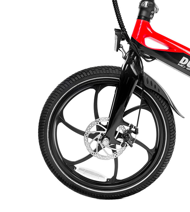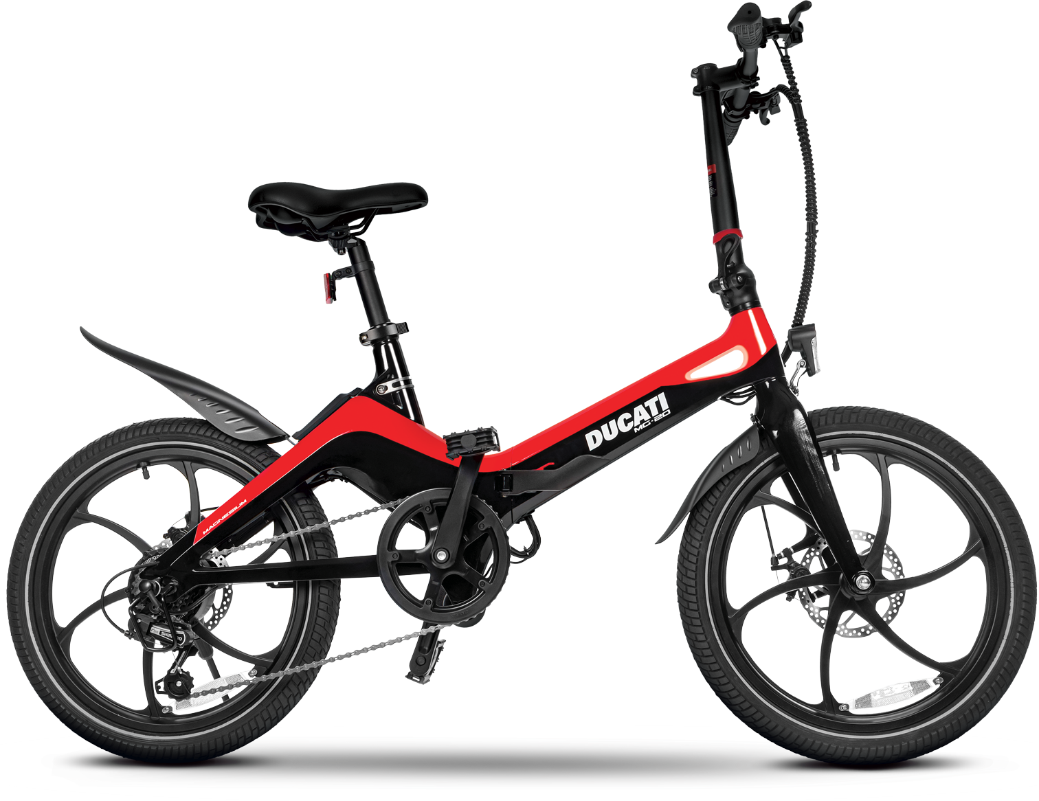 杜卡迪 MG-20 有 20英寸 轮子和快速折叠机构。折叠自行车占用的空间很小,这有助于灵活性,并且可以与私人或公共交通工具结合使用。它有一个电动机 250瓦 动力并提供踩踏辅助。三星电池,有容量 10.5啊 有足够的能量 50公里 很长一段路。电动自行车的速度限制为 25公里/小时.
