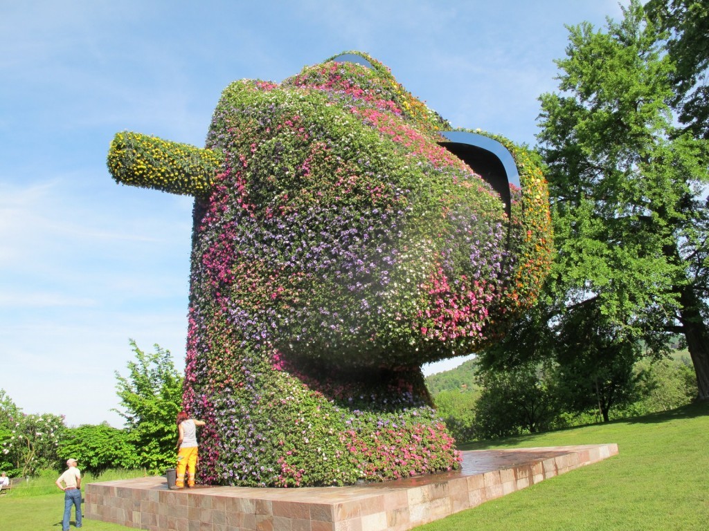 雕塑命名 “分裂摇杆”,由鲜花制成,高达12米,重达150吨。这座美丽的粉色雕像由两个互补的部分组成。第一部分是一匹儿童摇摆小马,第二部分则是一只恐龙。杰夫同时还准备了另外两件雕塑作品,一件将在惠特尼博物馆展出,另一件则是为了补充格伦斯通博物馆丰富的藏品。