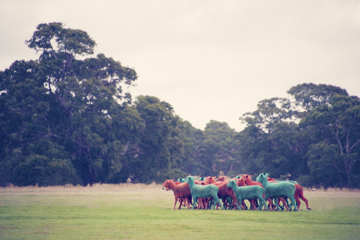 灰色树莓 是一位摄影师 梦幻照片系列 镜头里的田野里抓羊。那么这没什么不寻常的——但如果他之前就用 无害植物染料。羊在嚼草、跳跃、奔跑、咩咩叫,以及做羊所做的一切事情。 彩虹的颜色.
