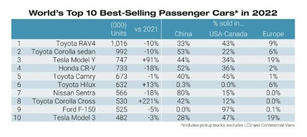 她拿了前两个位置 丰田, 她卖了 992.000 豪华轿车 花冠 超过一百万 越野车 RAV4.考虑到特斯拉汽车相对较高的价格以及该公司进入汽车市场的时间相对较晚,特斯拉令人印象深刻的壮举就显得更加引人注目。