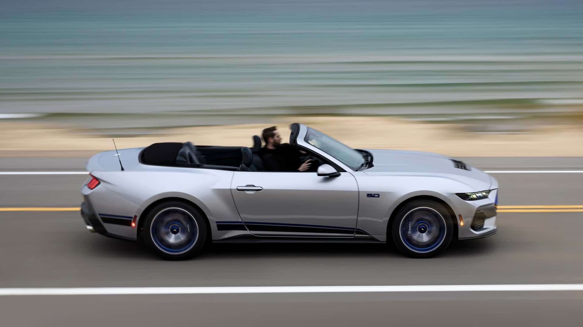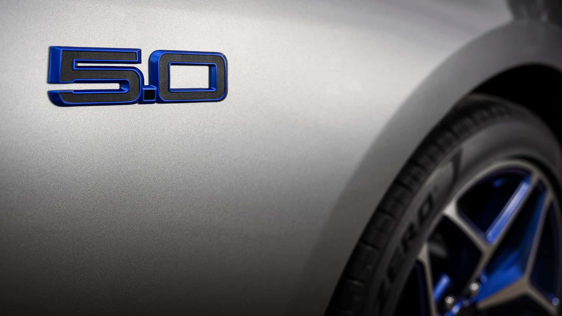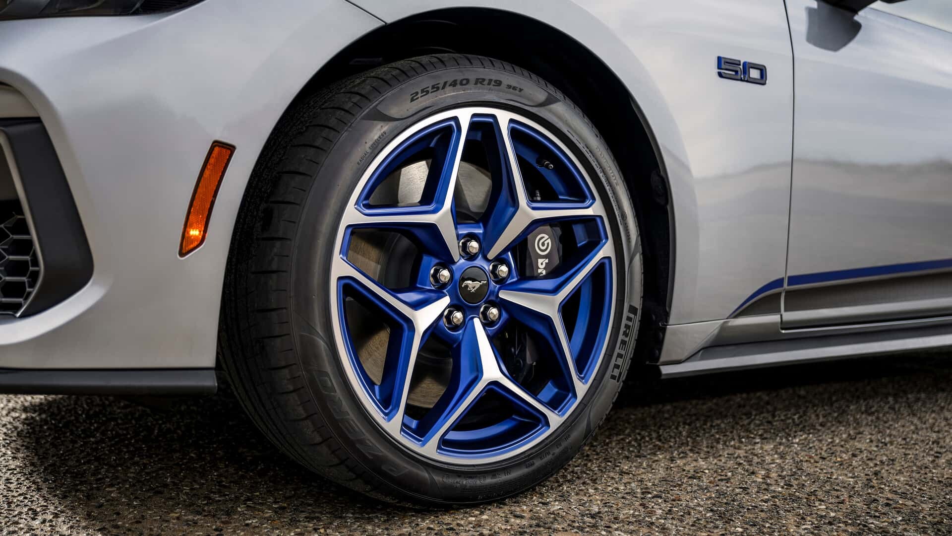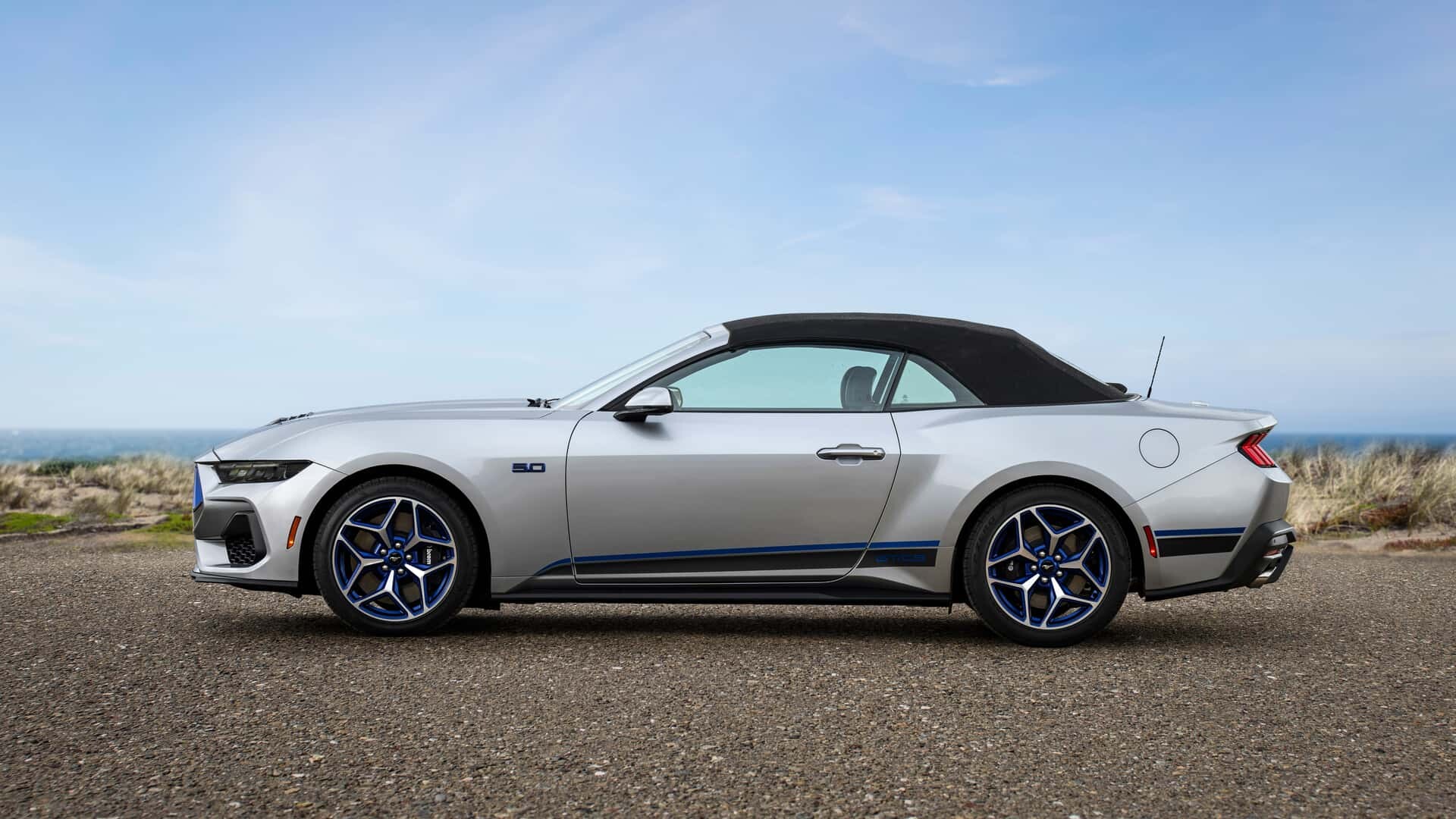 福特野马 GT 加州特别版 2024 2024 年,它通过前进气口上标志性的“Rave”蓝色装饰吸引了人们的注意,周围是哑光黑色格栅。 5.0、GT 和 GT/CS 徽章以及可选的 19 英寸车轮上还带有其他 Rave Blue 装饰。侧面的双色贴纸以及仪表板和脚垫上独特的“California Special”徽章也强调了该车型的独特性。