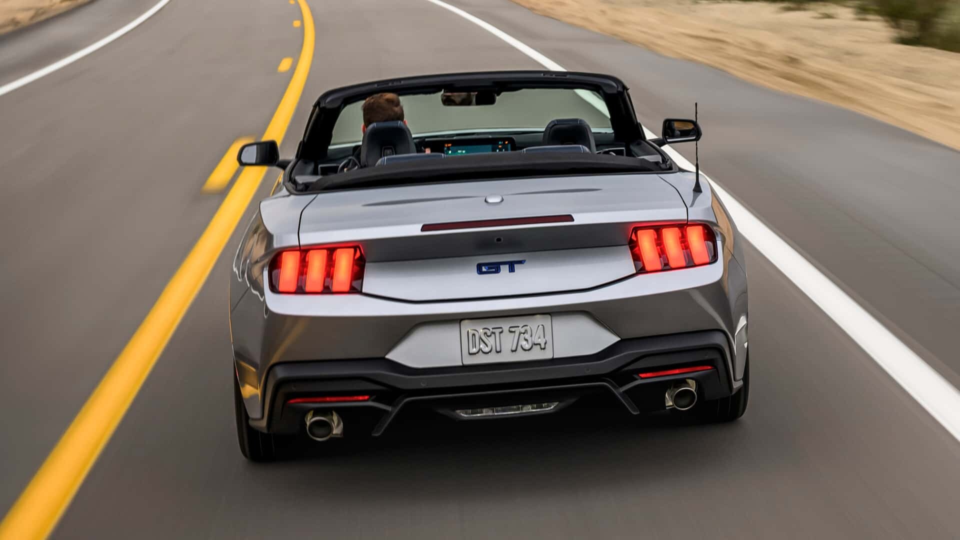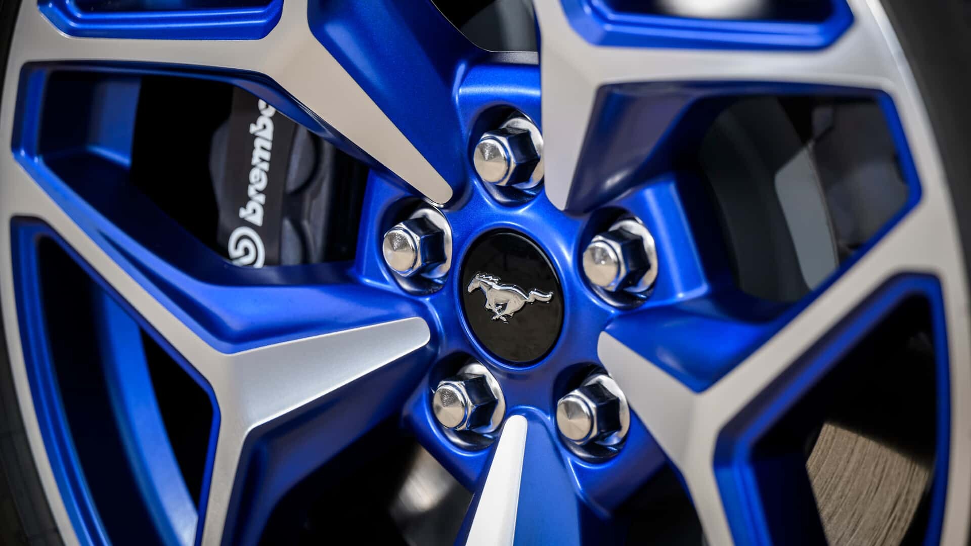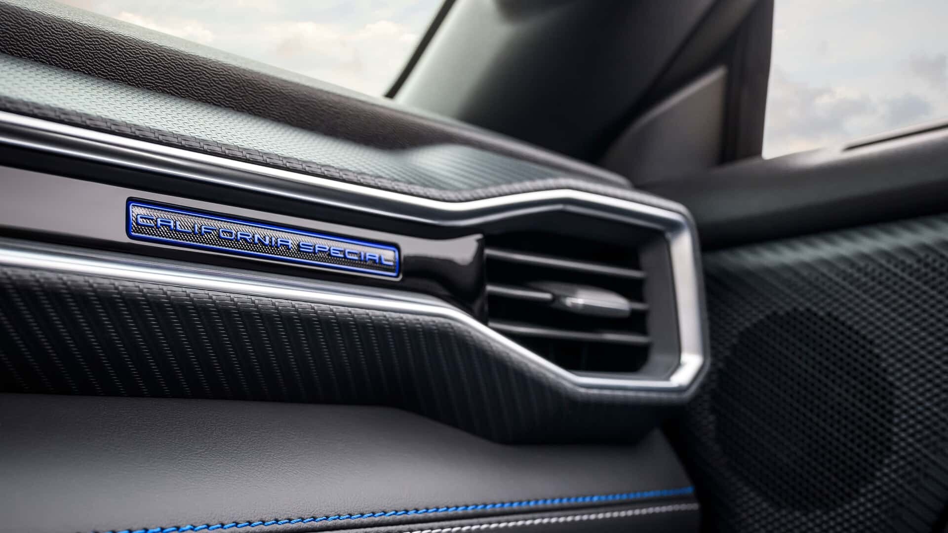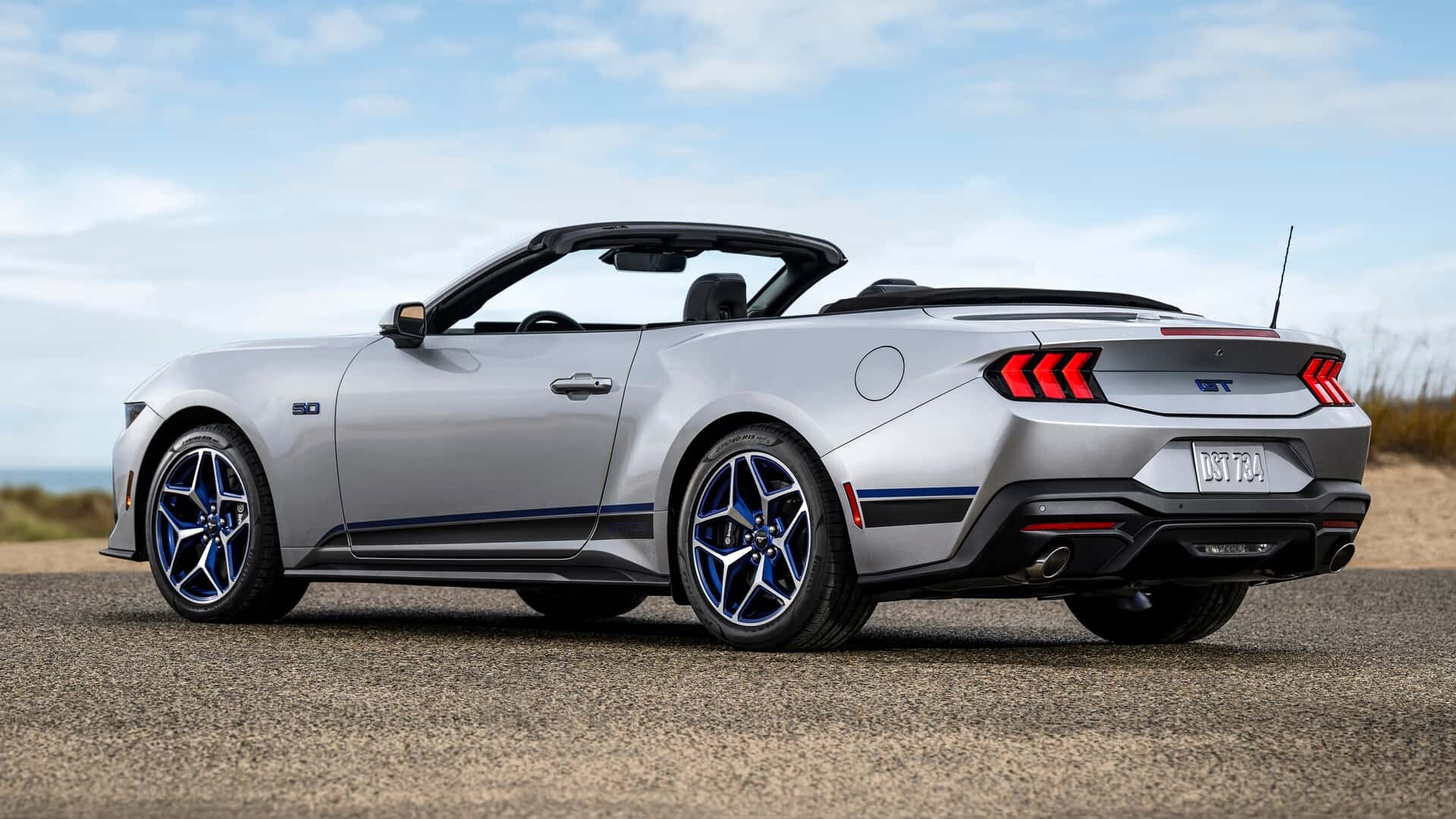 福特野马 GT 加州特别版 2024 2024 年,它通过前进气口上标志性的“Rave”蓝色装饰吸引了人们的注意,周围是哑光黑色格栅。 5.0、GT 和 GT/CS 徽章以及可选的 19 英寸车轮上还带有其他 Rave Blue 装饰。侧面的双色贴纸以及仪表板和脚垫上独特的“California Special”徽章也强调了该车型的独特性。