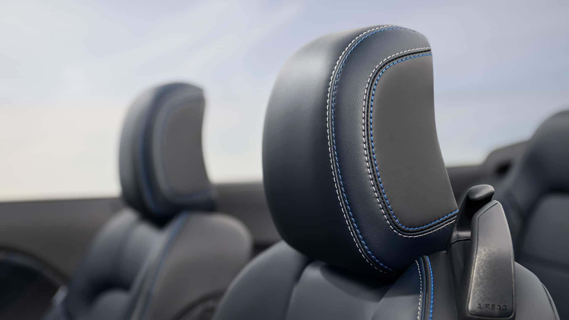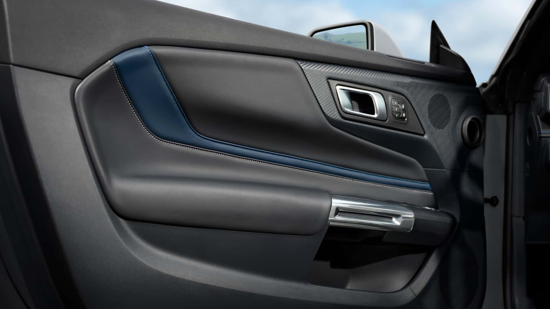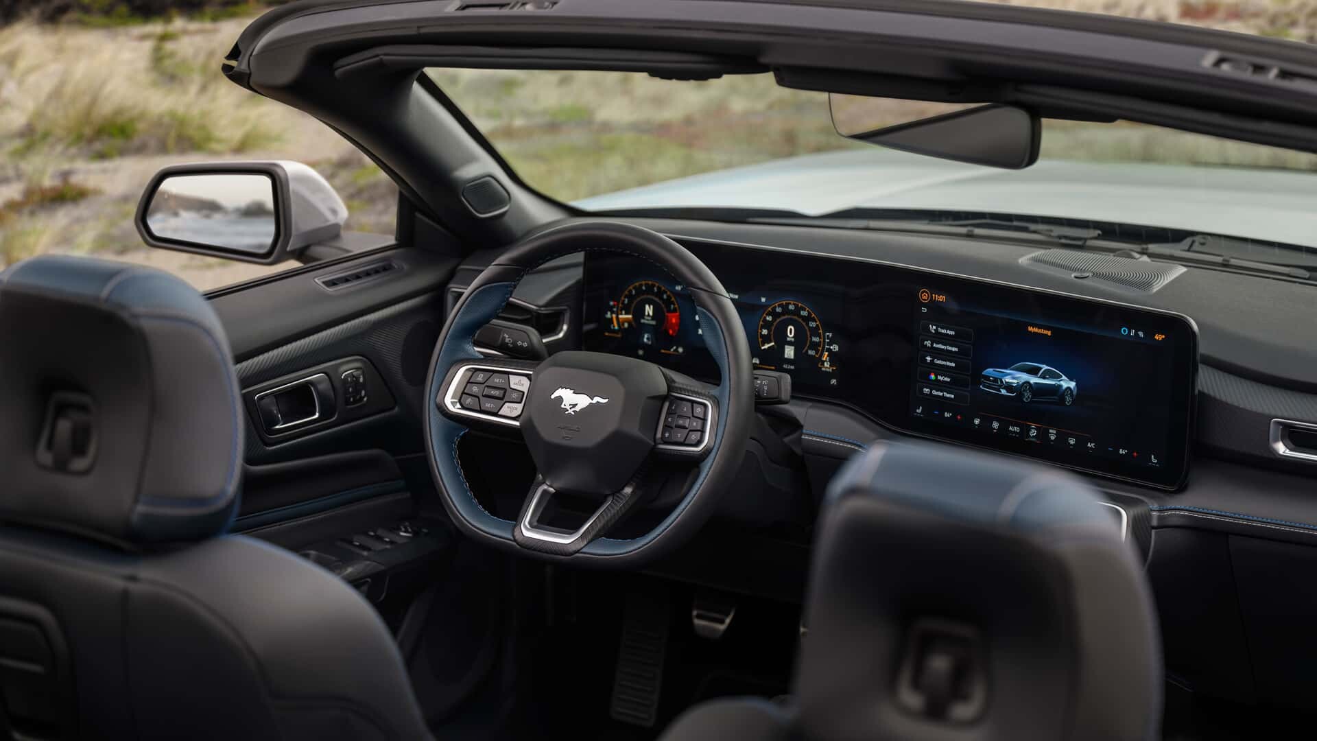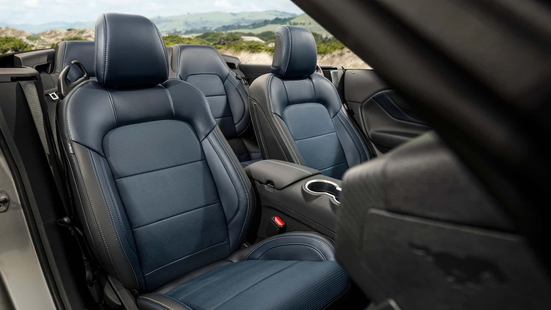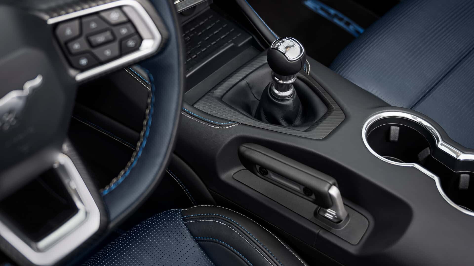Mustang GT California Special 的内饰采用精致的彩色皮革装饰 海军码头 和 乌木黑 门卡、仪表板和方向盘上可见猛禽蓝和金属灰缝线。这种缝线为已经设计精美的内饰增添了独特的触感。这款特别版野马 GT 向 1967 年的原版致敬,当时它是为了应对当时的销售挑战和竞争而首次推出的。它被设计成加州自由精神和乐观驾驶文化的象征。