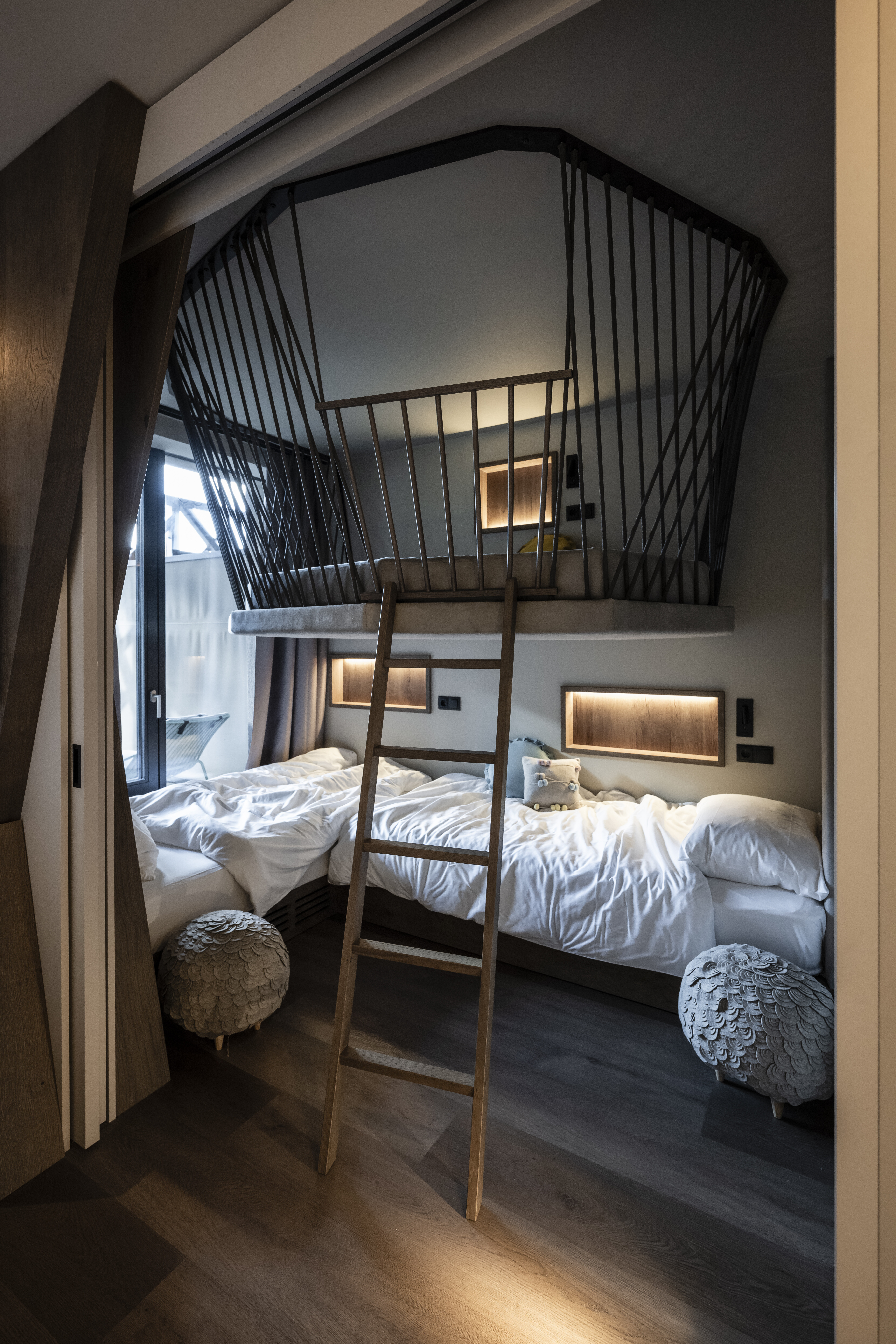 度假村新增客房 36 间,总人数攀升至118,特别注重家庭友好的住宿。每个房间都有独立的父母和孩子区域,由滑动隔断隔开,还有一个大浴室,水槽的高度不同。儿童区设有三张床,其中一张是受酒店象征猎鹰启发的嵌套床。即使无人居住,巢巢也为孩子们提供了一个有趣的玩耍空间。