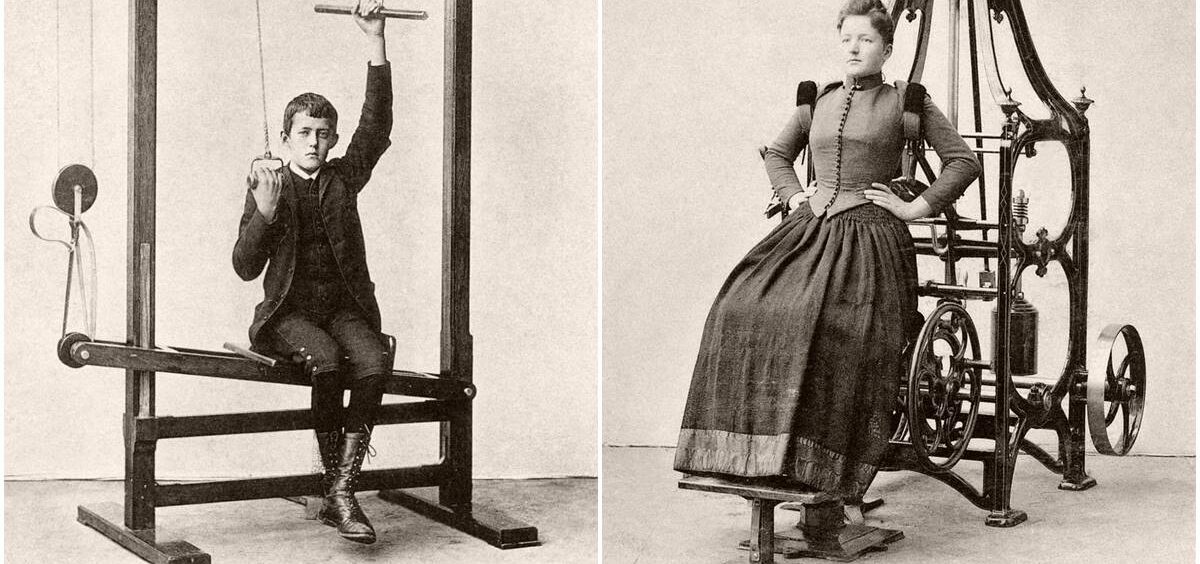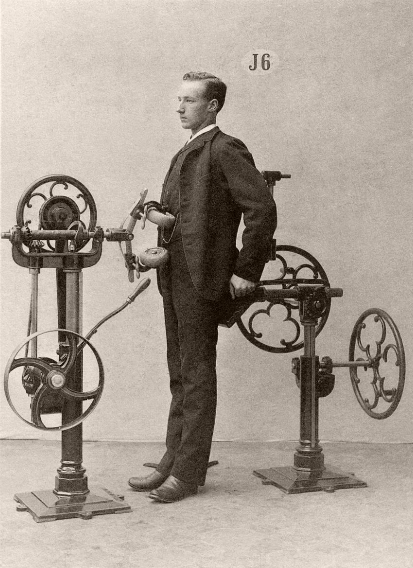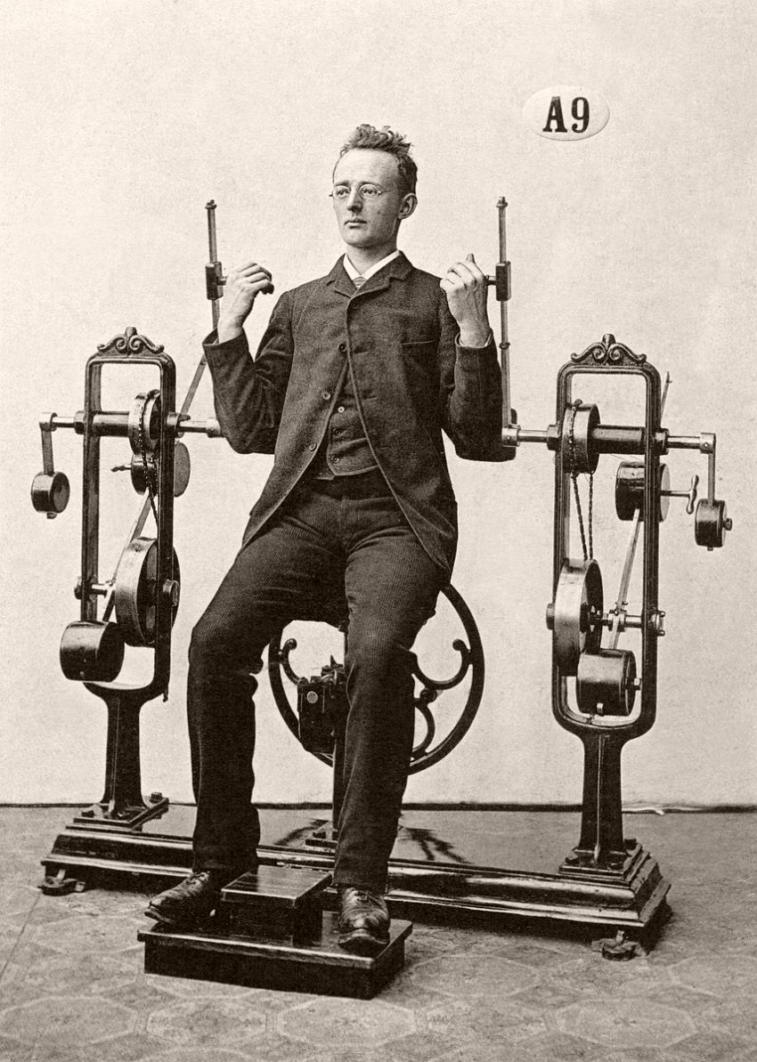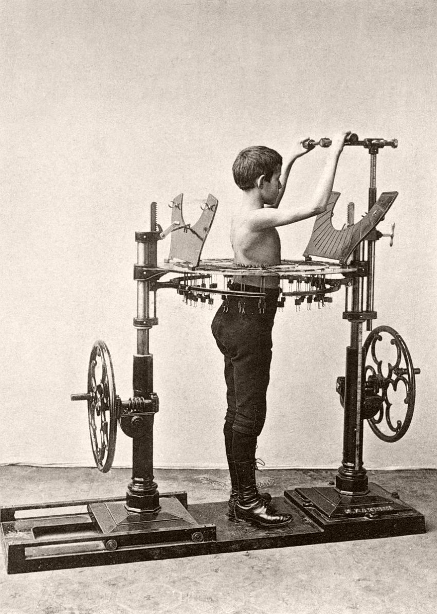 赞德制造了一些带有配重、手柄和弹簧的木制机器,人们可以用它们来锻炼。他为那些感兴趣的人提供了如何使用它们的说明,就像今天的私人教练所做的那样。随着时间的推移,设备变得越来越复杂,因此其中一些设备的操作 1868 也使用了蒸汽机,因为 1890 和电动机。