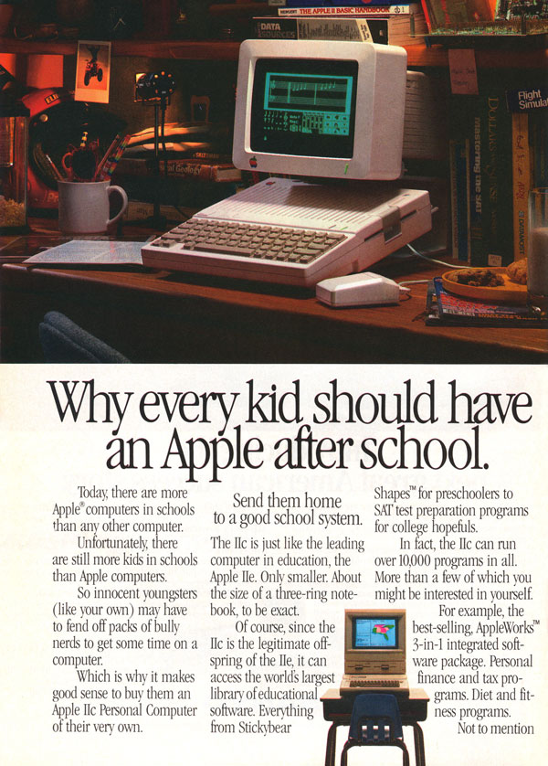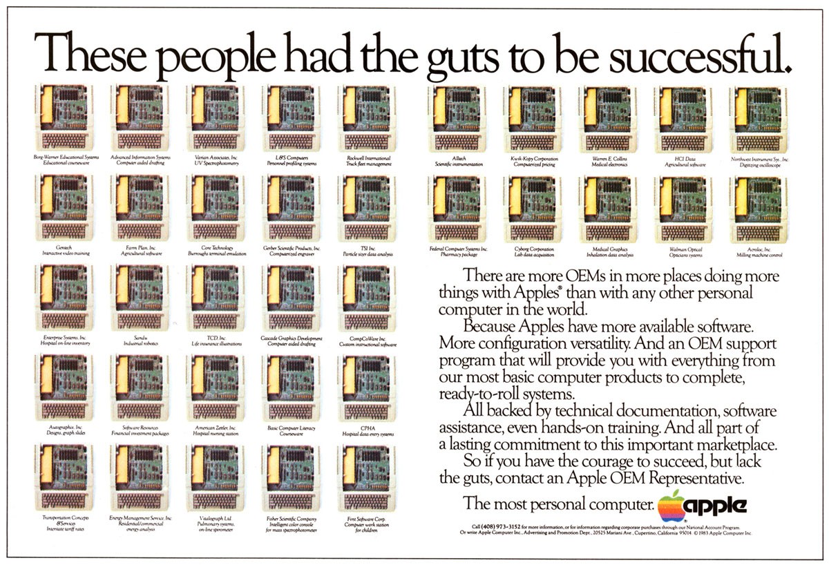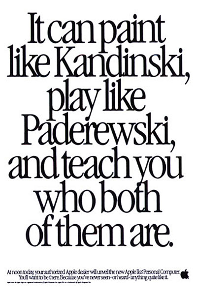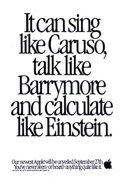 他们在 20 世纪 70 年代的第一个战略是基于苹果电脑的可用性和易用性,在 1980 年代,他们的口号是 “每个孩子放学后都应该有一个苹果” 也开始押注他们的苹果附带的派对卡。突破发生在 20 世纪 90 年代,当时苹果电脑开始被诸如创新、炫酷、与众不同,当然还有设计精美等形容词所认可。请查看我们的画廊,了解 20 世纪最后 30 年代的一些最佳复古广告,这些广告使 Apple 至今无人能敌。