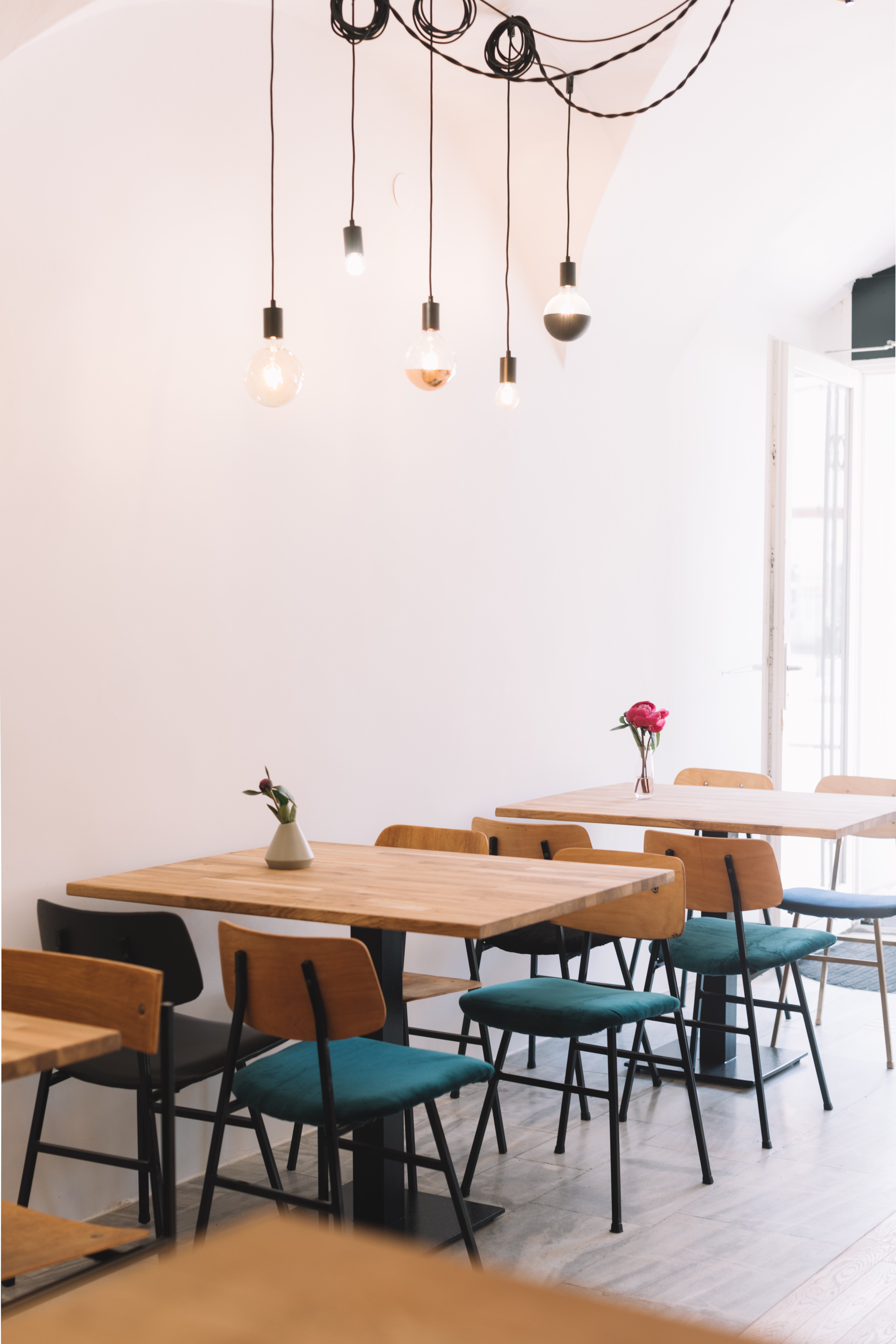 Vsi stoli so retro – rabljeni, obnovljeni in ponovno v uporabi. Del stolov sta pustila v originalni obliki, to so stoli Nika Kralja, del stolov pa sta preoblekla v pisan žamet. Nekatere mize v lokalu in na vrtu so prav tako 手工 – izdelane iz mozaičnih in klasičnih belih ploščic.