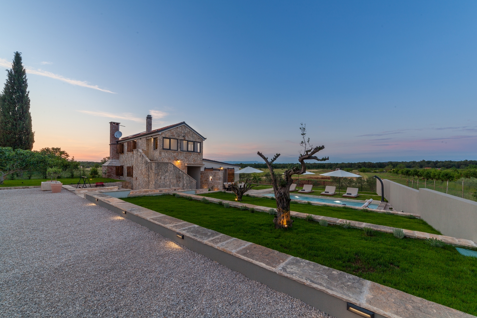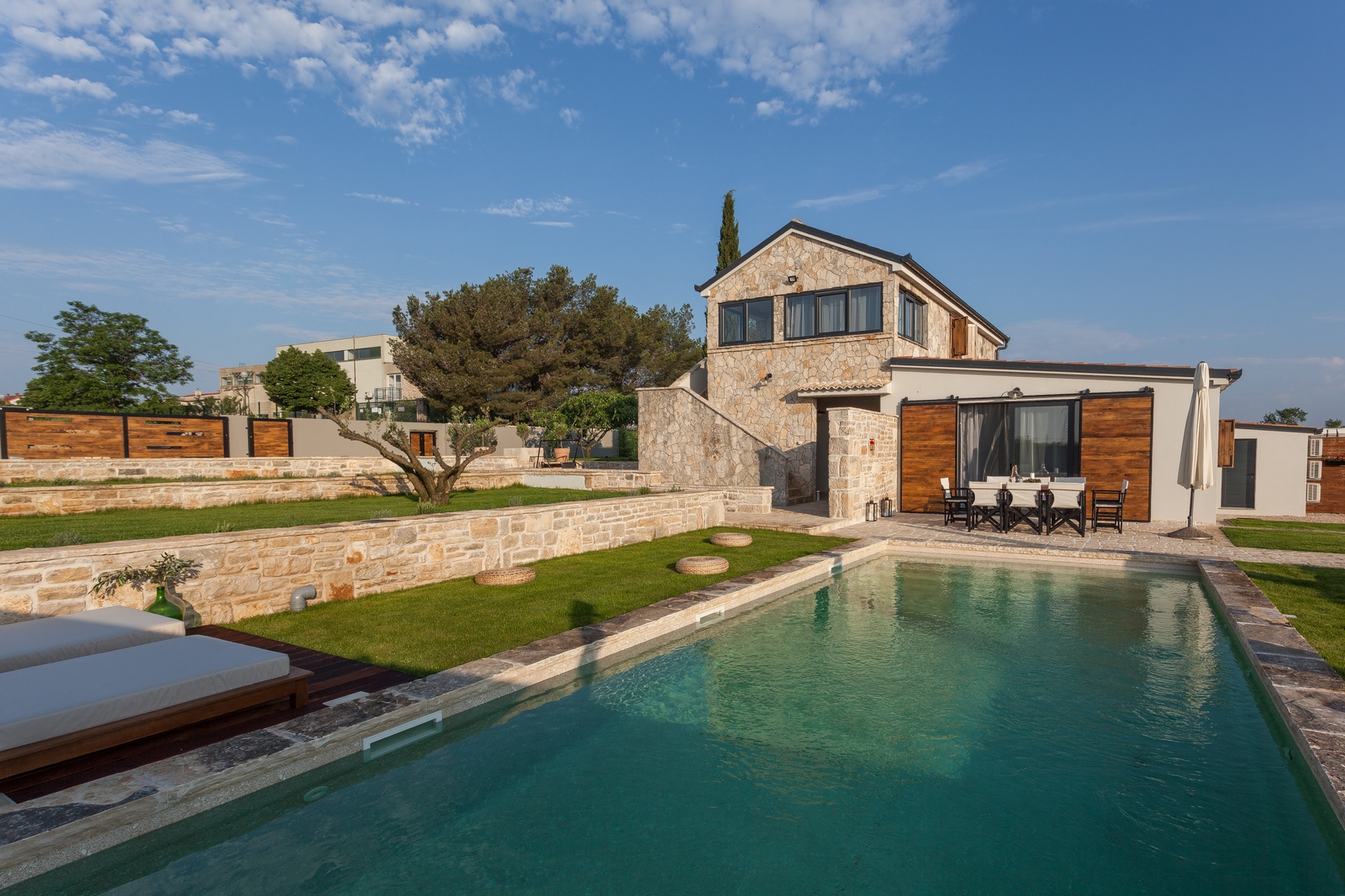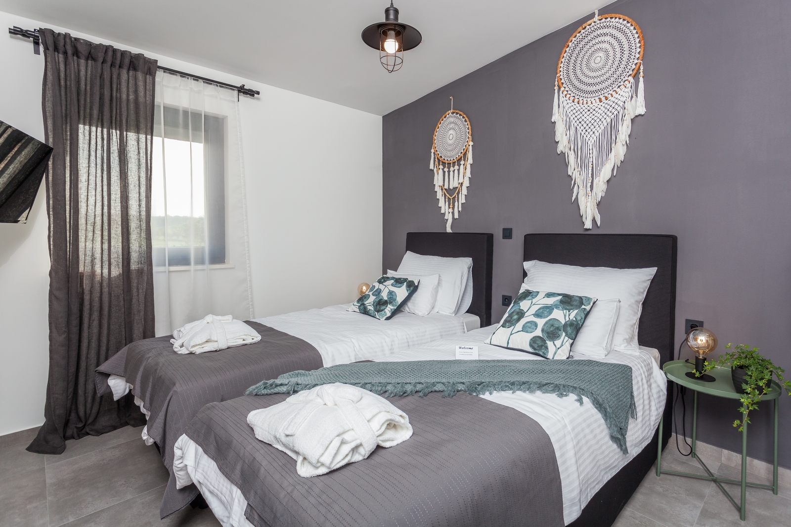 V hišici lahko biva osem oseb. Na voljo so namreč štiri spalnice in štiri pripadajoče kopalnice. V pritličju se nahajata velika kuhinja z notranjim kamnom in dnevni prostor, od koder je dostop na zunanjo teraso z bazenom. Ob bazenu je tudi prostor za sončenje, nad vilo pa bodo navdušeni tudi otroci, saj se na vrtu nahajata tudi tobogan in trampolin.