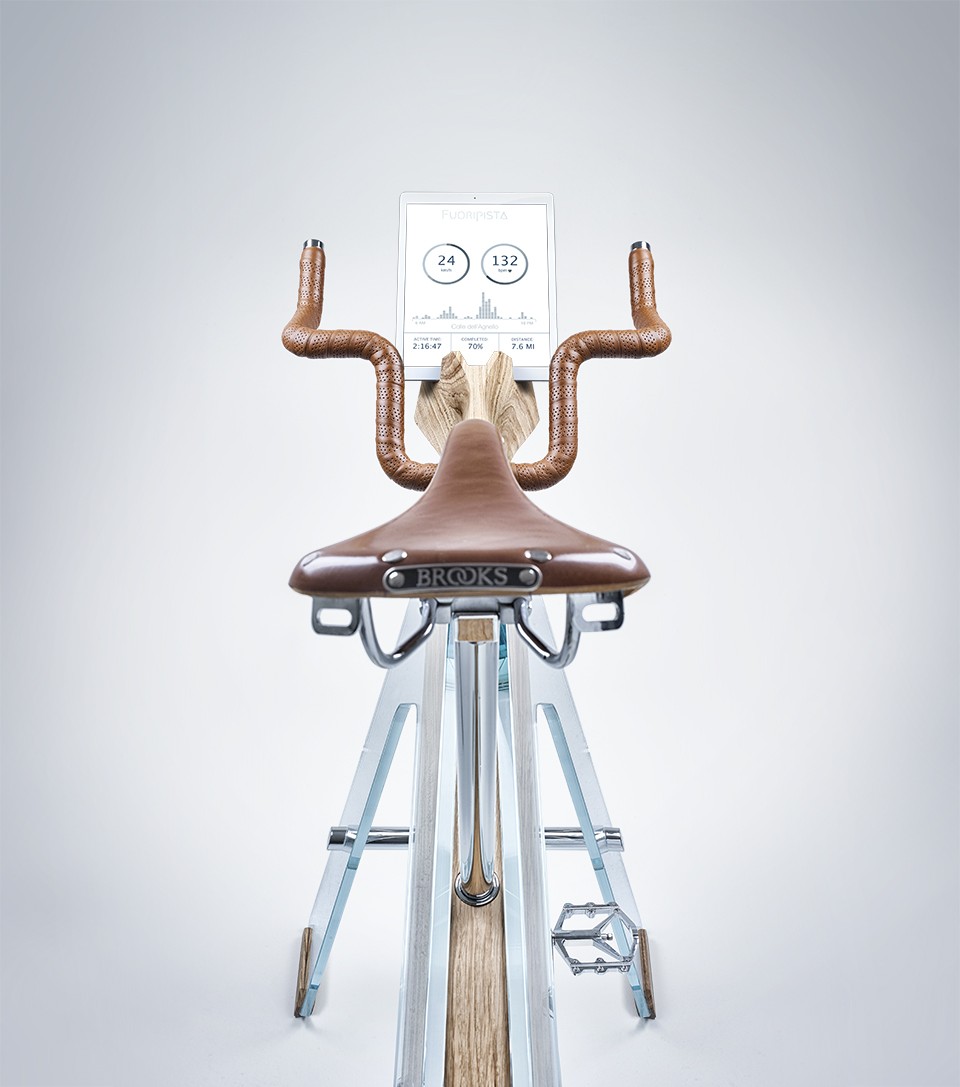 为了庆祝米兰年轻设计师沙龙 Salone Satellite 成立 20 周年,设计公司 Adriano Design 生产了 Fuoripista,一款由玻璃和木材制成的健身自行车。