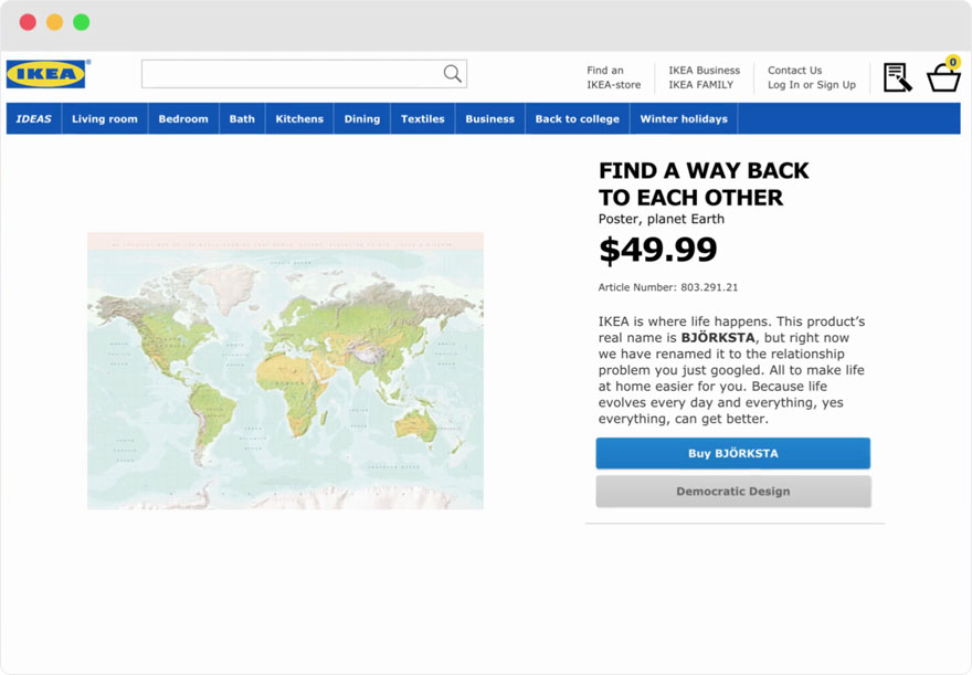 人们说,每有一种疾病,玫瑰就会生长,而宜家则说,每出现人际关系问题,它的产品就会“生长”。宜家以拥有有趣名称的产品而闻名。这并非巧合,因为创始人患有诵读困难症。因此,他发明了一种命名系统,而不是产品代码,以使产品更容易记住。他以瑞典岛屿命名花园家具,以男性名字命名椅子和桌子,以瑞典主要地点命名较大的产品……现在宜家向谷歌寻求灵感,并以关系问题领域搜索次数最多的术语命名产品。每个产品都解决了其命名的问题。