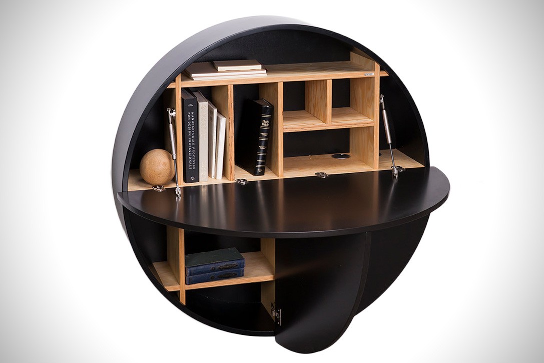 Okrogla stenska omarica skriva delovno površino, ki je dovolj velika, da lahko nanjo odložite 笔记本电脑, tablico ali zvezek.
