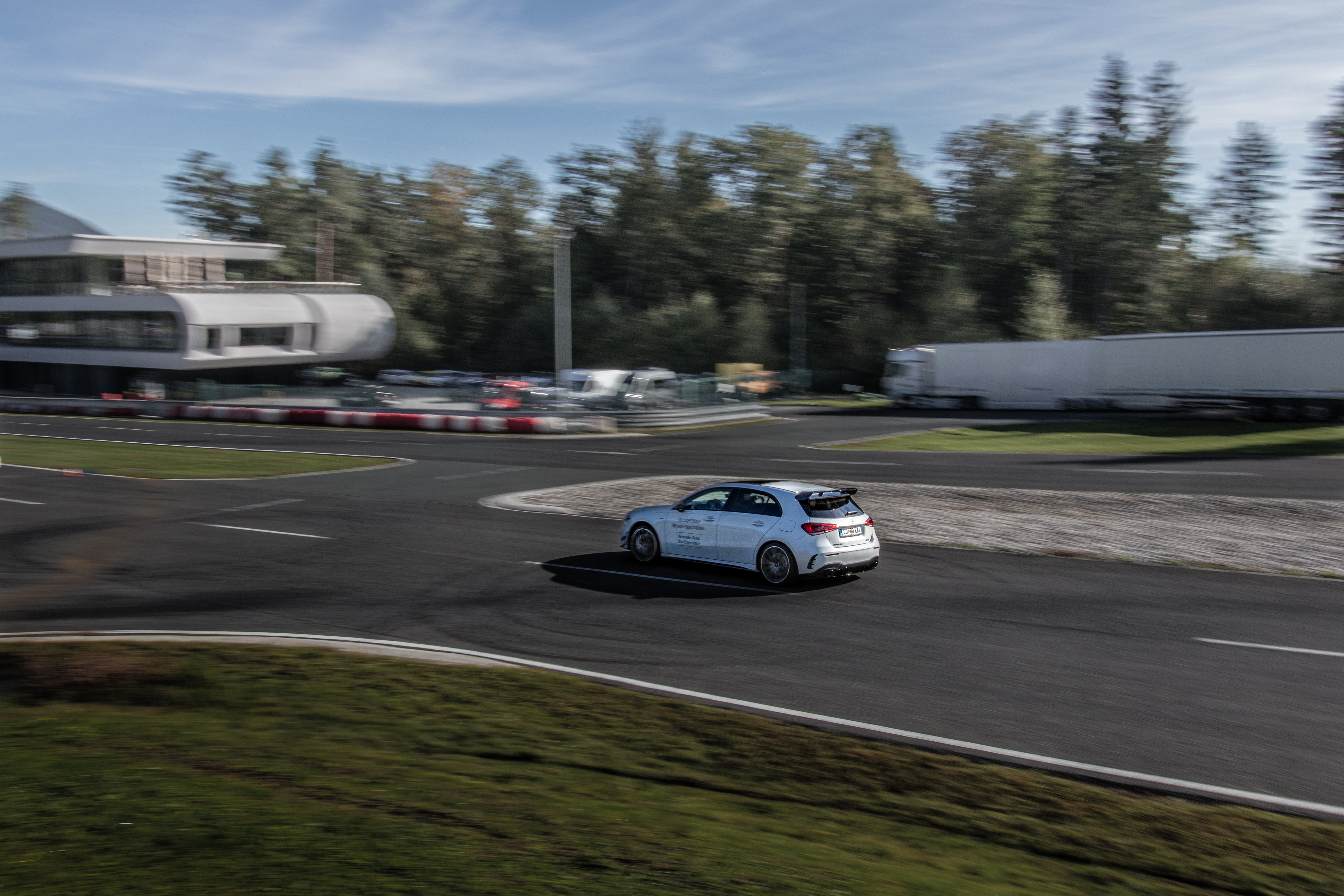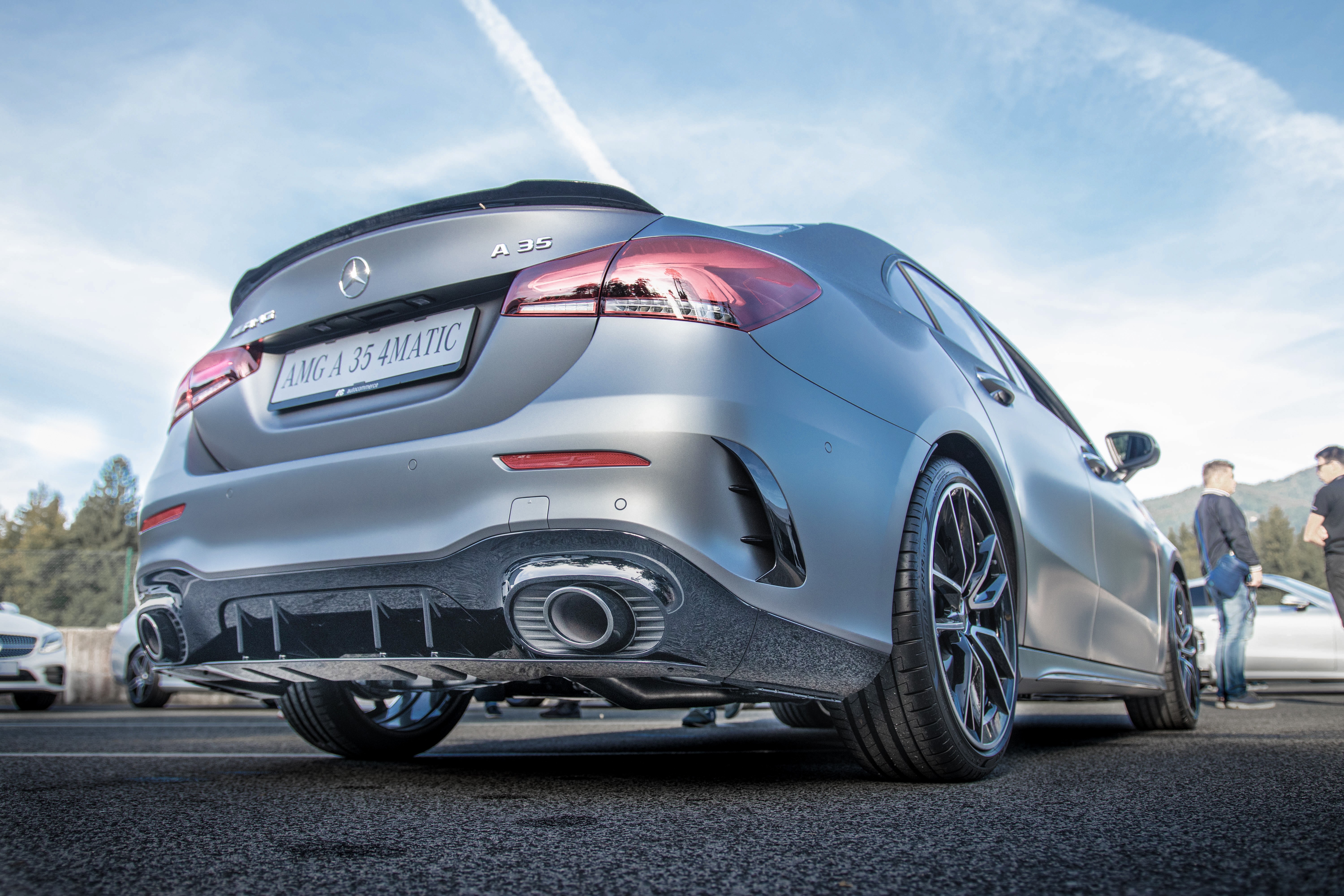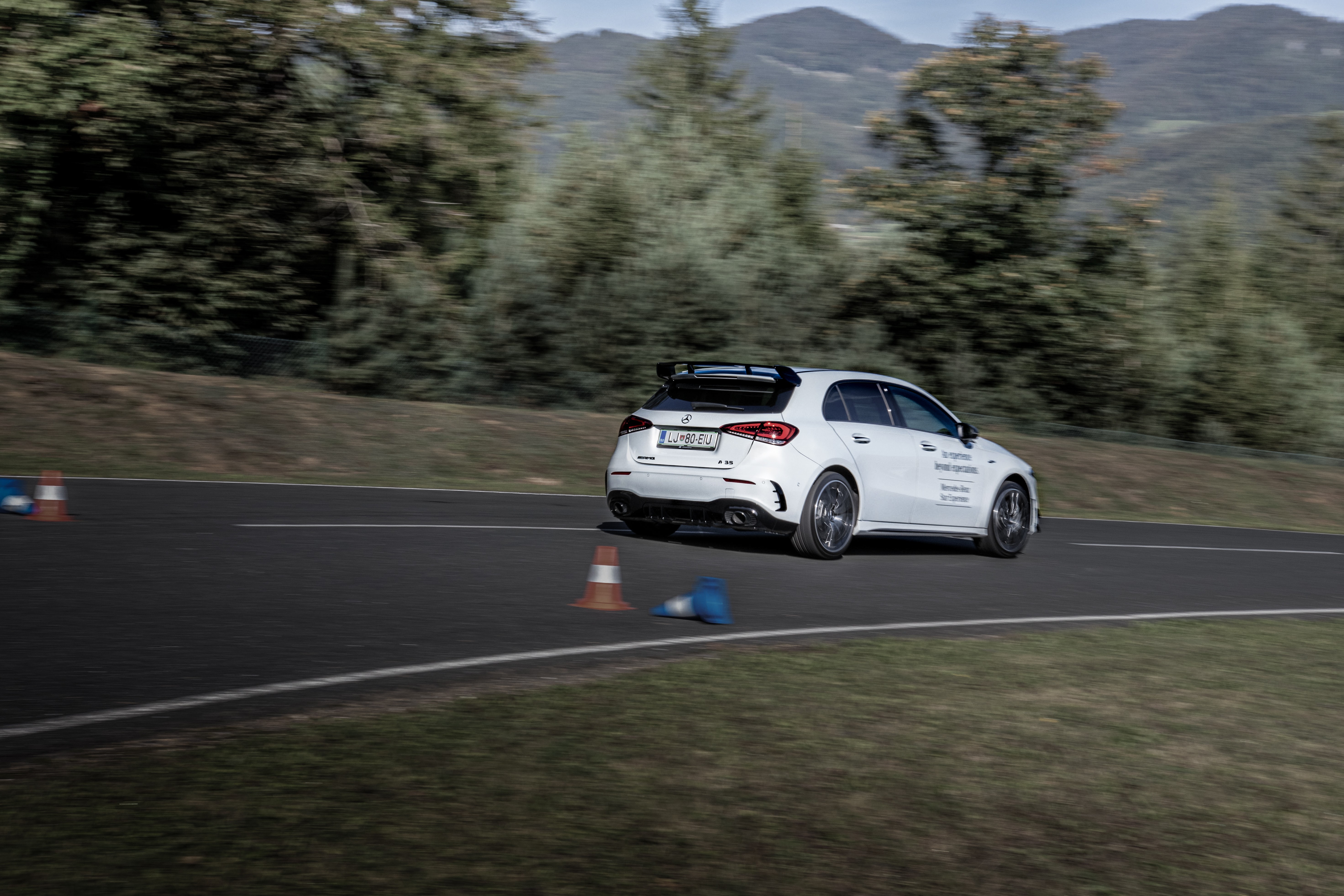 GT 4-door je kot najbolj premijski model družine AMG navduševal z vrtoglavimi pospeški (od 0 do 100km/h v 3,1 sekundi), ki jih omogoča biturbo 8-valjnik s 630 (470 KW) konjskimi močmi in udobjem, morda primerljivim z razredom S. Na postavljenem poligonu se je “kot doma” počutil mali A 35. Čeprav premore “samo” 306 konjev (225 KW), je zaradi občutno manjše teže in nekoliko bolj grobega podvozja bolje opremljen za napadanje šikan in ostrih ovinkov.