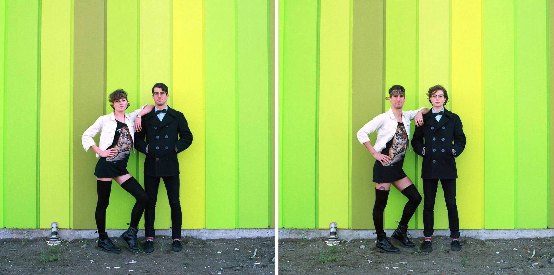 Kanadska umetnica Hana Pesut 带来 duhovito prezrcaljene portrete parov, ki drug z drugim v celoti zamenjajo svoja oblačila. Čeprav na videz preprosto dejanje, prinaša obilico smeha. S serijo “Switcheroo” je Hana sicer pričela že pred leti, a vizualni eksperiment pogosto ekstremnih fizičnih in stilističnih razlik med obema spoloma še naprej na razvedrilen način razbija stereotipe. Kako tudi ne bi, saj je razkazovanje poraščenega popka in prevelikih stopal, stlačenih v lične petke na eni ter prevelika oblačila pobalinskega izgleda na drugi strani ne le čudaško, temveč tudi nadvse komično.