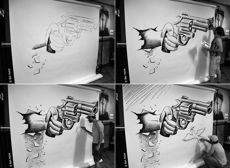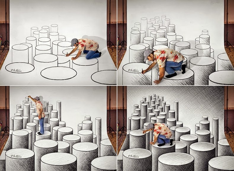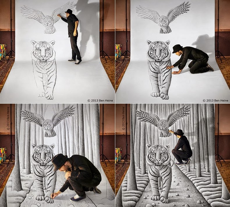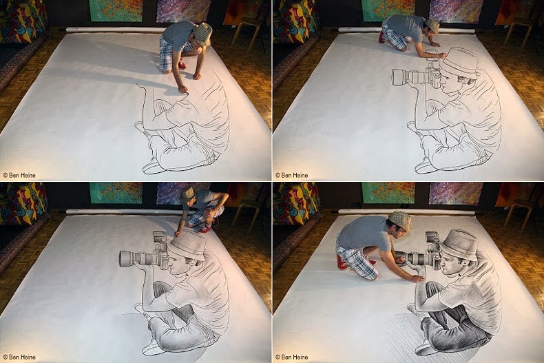 Belgijski umetnik Ben Heine je postal svetovno znan pred tremi leti, ko je pričel svoj fascinanten projekt Svinčnik proti kameri, v katerem je skico primerjal z resničnim ozadjem. Te dni pa Heine navdušuje s 3D skicami, ki skačejo iz platna. Njegova tehnika je poznana kot anamorfoza, optična iluzija, ki zahteva prav poseben vidik opazovanja. Posebnost, ki ga loči od ostalih umetnikov, je velikost njegovih platen, ki so ogromna. Celo tako velika, da z njimi lahko pozira tudi umetnik sam in tako postane del celotne kompozicije. Za vsako skico potrebuje vsaj teden dni.