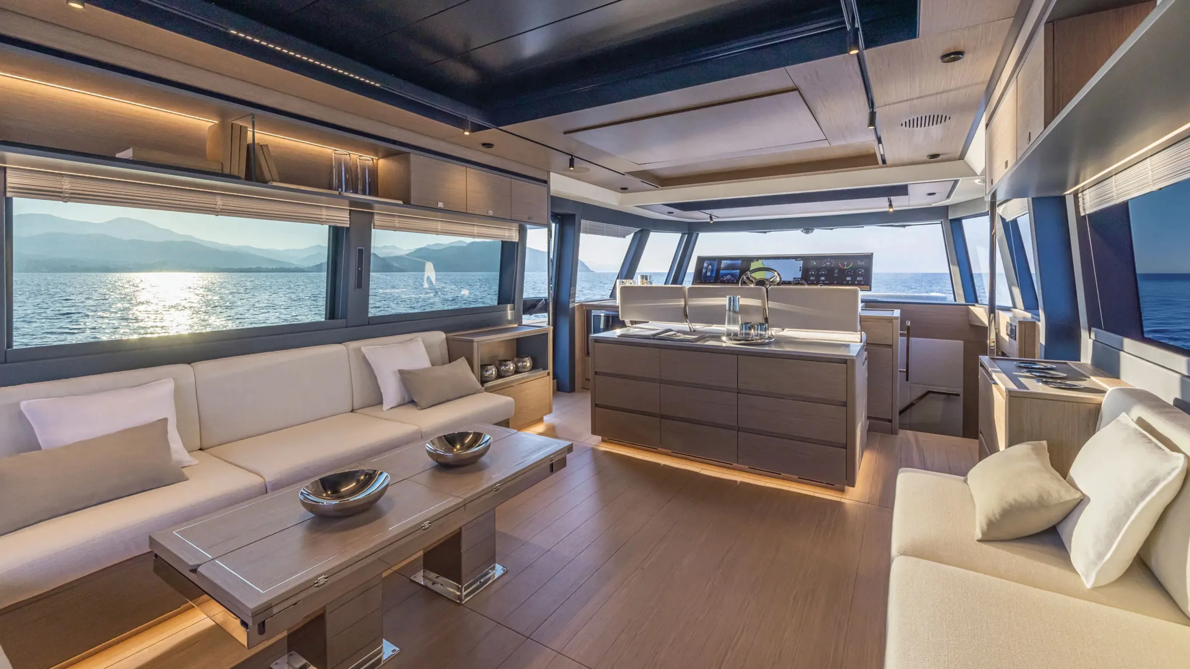 GT75 的驾驶台位于船体中央,360 度视野可俯瞰甲板,操作直观安全。三台 22 英寸 Garmin 显示屏可概览游艇的所有系统,包括导航系统、发动机系统和环视摄像头系统。