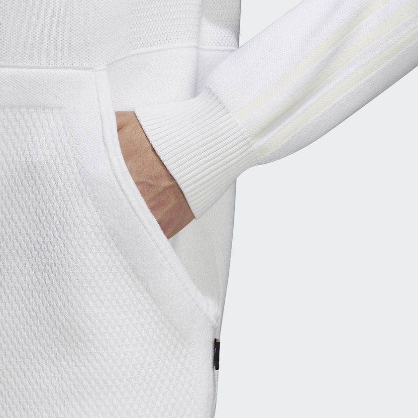 Tkanina primeknit v kombinaciji z usnjeno podlogo. Bele superge prav tako vključujejo adidasov in Hujev logo. Predvidena cena je 130 evrov.