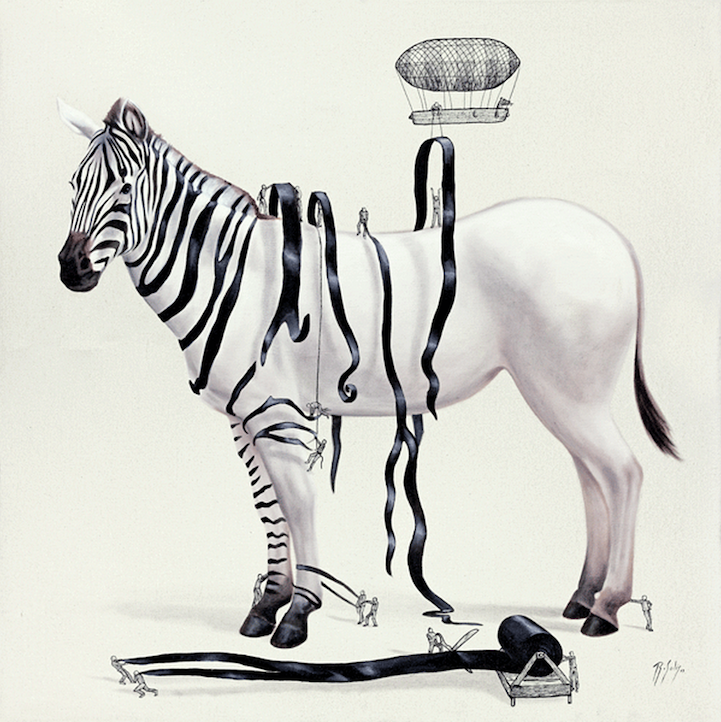 斑马不是天生的,而是成为一匹。对于斑马,你首先需要一匹白马,数米的黑胶带,小工人将它们切成碎片,并在齐柏林飞艇的帮助下将它们包裹在大型动物身上。鹈鹕用了很多粉红色......看看 Ricardo Solis 的俏皮插图,展示了这些动物是如何用丰富的想象力创造出来的!