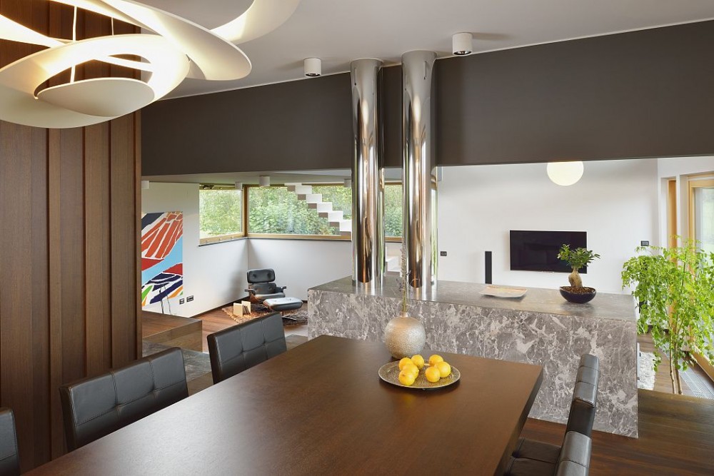 精彩的 现代房子, ki leži v zadnjih metrih Cerknice, je tudi navznoter tako fascinantna kot navzven. Prostori dihajo, dušo pa jim daje po meri ukrojeno pohištvo slovenskega družinskega podjetja Pobles, ki je narejeno iz orehovega furnirja, stene so ponekod obložene s perzijskim kamnom, v dnevni prostor pa nas vodijo svetleče stopnice, odete v hotaveljski marmor.