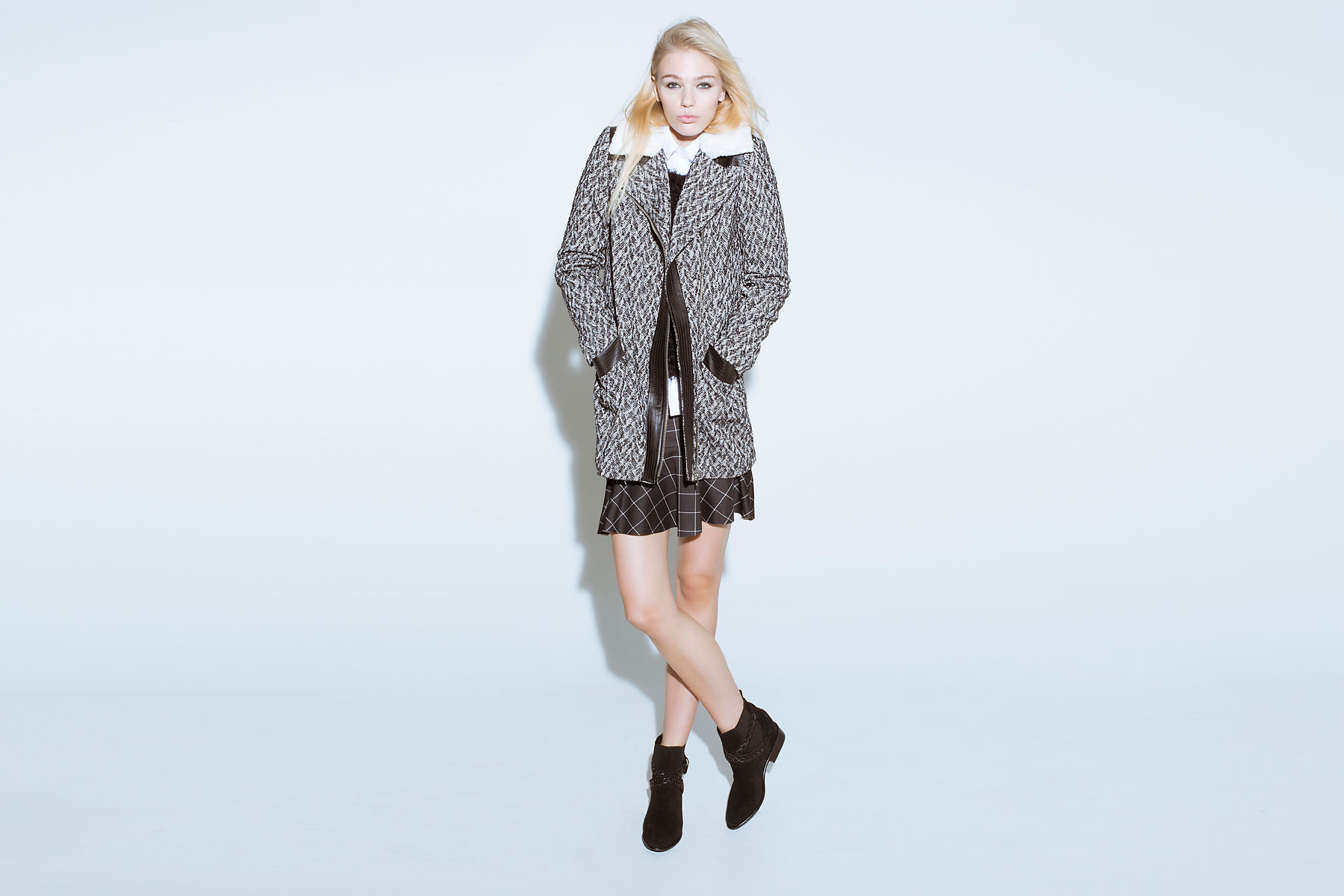 Stylingi kratkih, širokih A-kril z ohlapnimi pleteninami, široki karo plašči v kombinaciji z oprijetimi hlačami v pepita vzorcu ponujajo pogumne ideje za sestavljanje vzorcev. Kolekcija od dnevnih do večernih videzov je zaokrožena z modnimi dodatki v črno-belih in črno-zlatih barvah. Ne manjka niti črna čipka, masiven nakit ter bikerski gležnarji. Zaljubljeni!