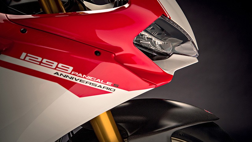 Nadgradnja modela Panigale 执行中 1299 S Anniversario pomeni predvsem vračanje h koreninam in osnovam te izjemne motoristične blagovne znamke, ki v svojem ustvarjanju motorističnih umetnih vselej goji predvsem strast. Pod vplivom dirkaške zgodovine se Ducati 1299 Panigale S Anniversario grafično vrača h koreninam tudi s posebnimi zlatimi platišči, ki so bili tako zelo značilni za to blagovno znamko v 80. letih. Tudi oklep motorja je odet v tako zelo značilno rdeče-belo dirkaško kombinacijo. Ekskluzivnost zagotavljajo ročno narejeni posebni detajli in omejena serija motorja, ki si ga bo v prihodnosti lastilo le 500 srečnežev.