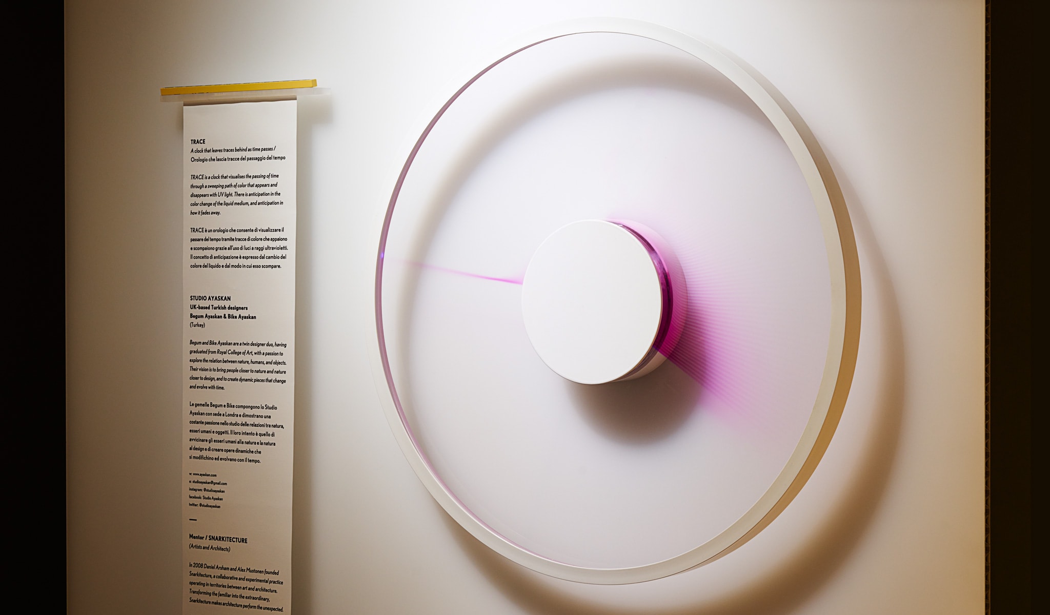 Oblikovalki Ayaskan sta želeli z uro Trace vizualizirati minevanje časa. Dejansko ga prikazujejo različne barvne sledi. Izdelek namreč vsebuje tekočino z 紫外线. Zasnovo sta ustvarili za natečaj Lexus Design Awards 2016 pod mentorstvom organizacije Snarkitecture. Ura, kjer laserji kažejo minevanje časa je prepričala sodnike in bila nagrajena.