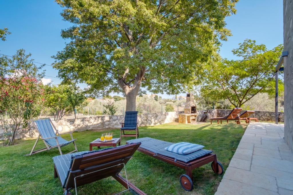 Pred hišo se nahaja mogočna vinska trta, stara več kot 150 let. Pod njo je mogoče v poletnih dneh uživati v udobnih sedežih in se hladiti v senci. Vila se pohvali tudi z zunanjim žarom in veliko jedilno mizo na terasi.
