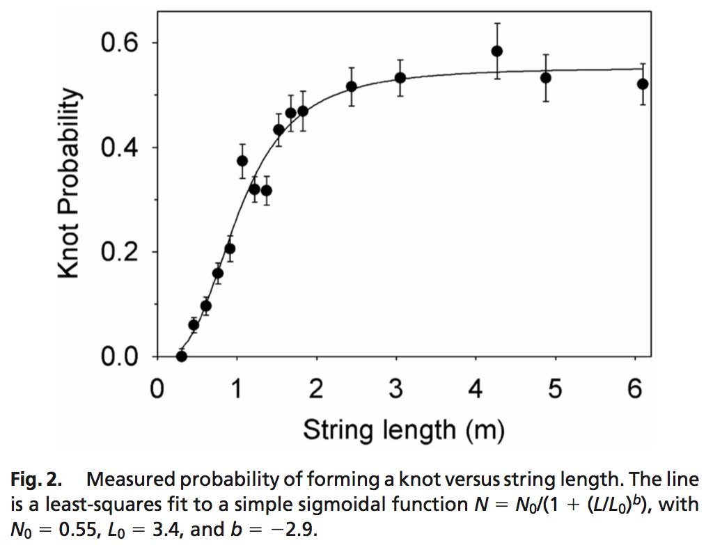Sploh zdaj, ko za vsem skupaj stoji znanost. Raziskovalci so namreč identificirali dejavnike, ki povzročajo zapletanje Applovih slušalk. Vem da ni treba, da vam razlagam kako nadležno je, ker se slušalke ‘učijo’ vozlov vsakič, ko jih imate v žepu. Ker to veste. Kar pa ne veste je, kaj privede do tega. Izkazalo se je, da sta glavna krivca dolžina kabla in količina tresljajev. In ko se ta dva falota zarotita en proti drugemu, so znanstveniki sposobni prepoznati krivuljo, ki razkriva stopnjo verjetnosti zafecljanja. Zadnje ugotovitve se navežejo na raziskavo »Spontaneous knotting of an agitated string« (Raymer in Smith, 2007), ki ugotavlja, da se vrv zaprta v škatlico, krajša od 46 cm, ne bo skoraj nikoli zapletla- ne glede na stopnjo ‘aktivnosti’. A ko gre za vrv dolgo med 46 in 150 cm, bo verjetnost skokovito narasla. Kar je daljše pa možnost dvigne celo nad 50%, kar pa je nekje tudi meja prek katere ne gre, saj je vrv v tako majhnem prostoru potlej že sama sebi v napoto. Da ti podatki niso iz trte zviti priča 3415 poskusov, iz katerih je nastal sledeči graf: